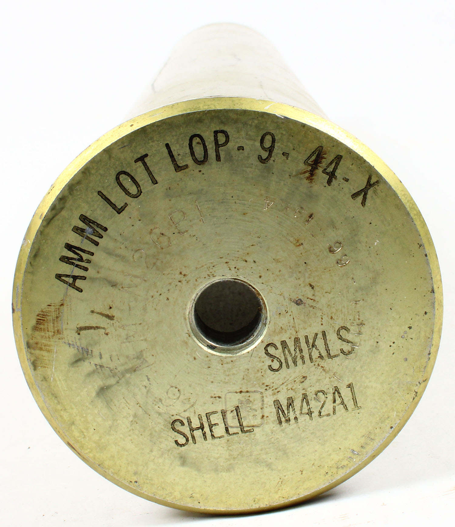 US, 76mm, Military shell, H/S ''76MM M26BI'', ''LOT CLM-1-66 1954'', ''AMM LOT LOP-9-44-X'', ''SMKLS'', ''SHELL M42A1'', OAL- 21 1/4''. Grade: Very Good + - Value: 10 to 100