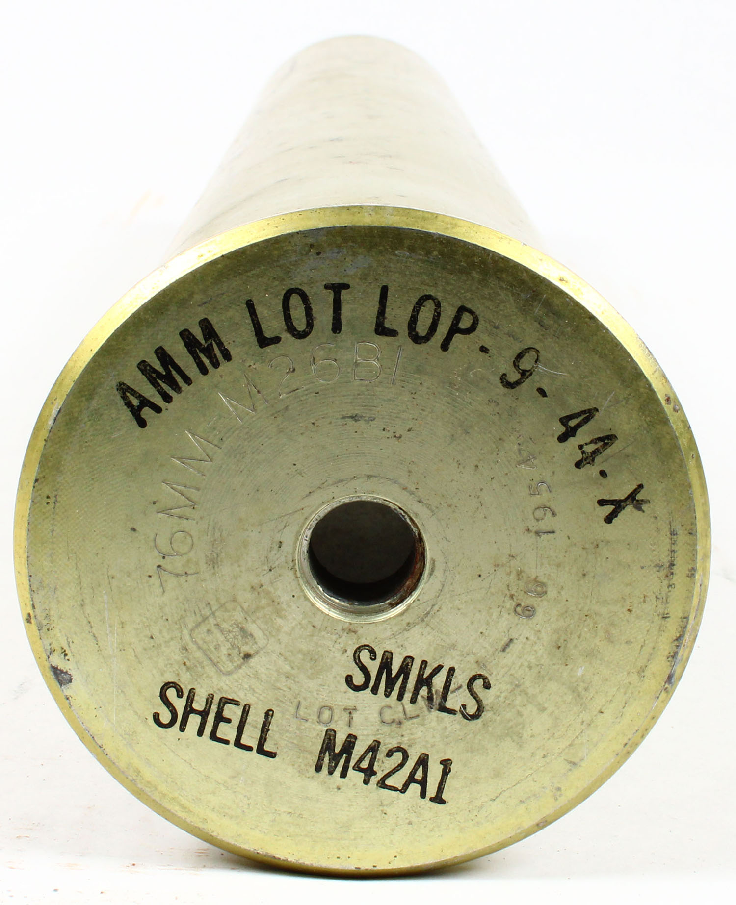 US, 76mm, Military shell, H/S ''76MM M26BI'', ''LOT CLM-1-66 1954'', ''AMM LOT LOP-9-44-X'', ''SMKLS'', ''SHELL M42A1'', OAL- 21 1/4''. Grade: Very Good + - Value: 10 to 100