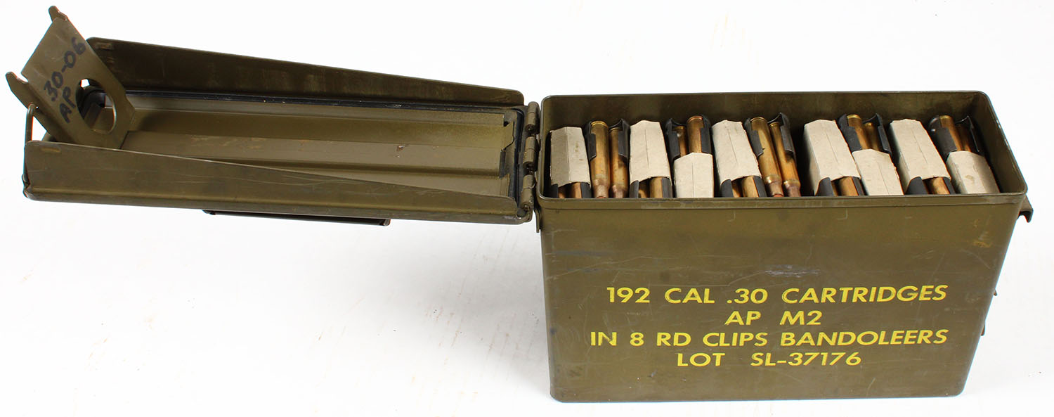 Military ammo can, Full of 30, 8RD. Clips of 30-06 some black tip some normal Ball, ammo is very good. Grade: Excellent - Value: 100 to 300