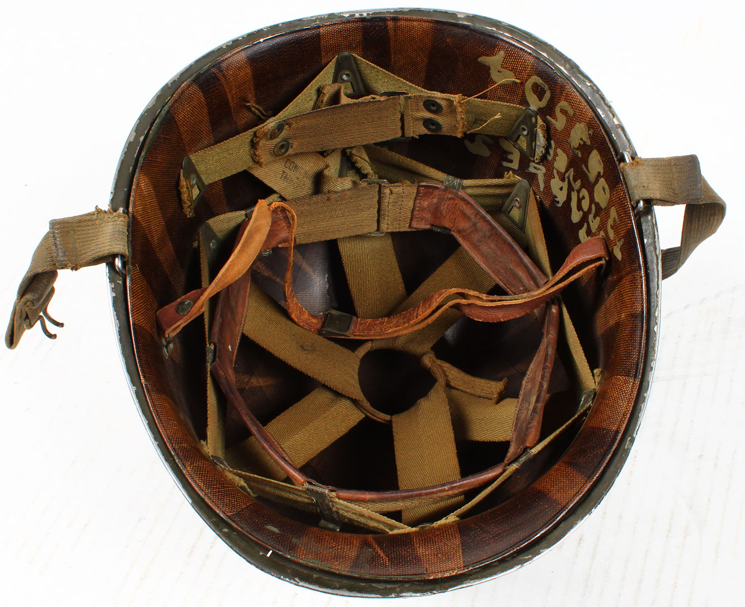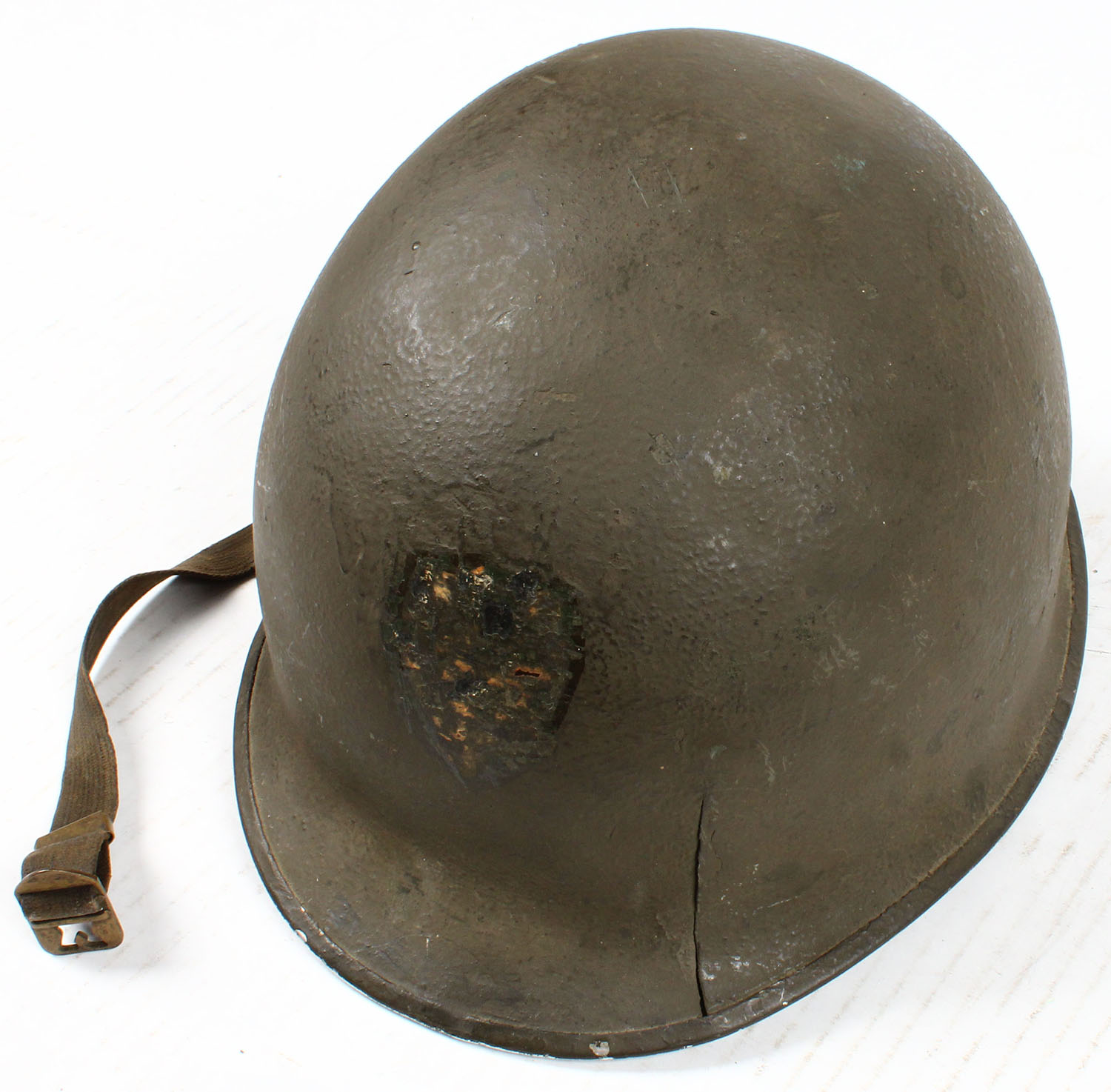 US, M1 Helmet, Has Liner inside, 2 1/2'' Crack on front, faint symbol on front of helmet that's worn. Grade: Very Good - Value: 20 to 100