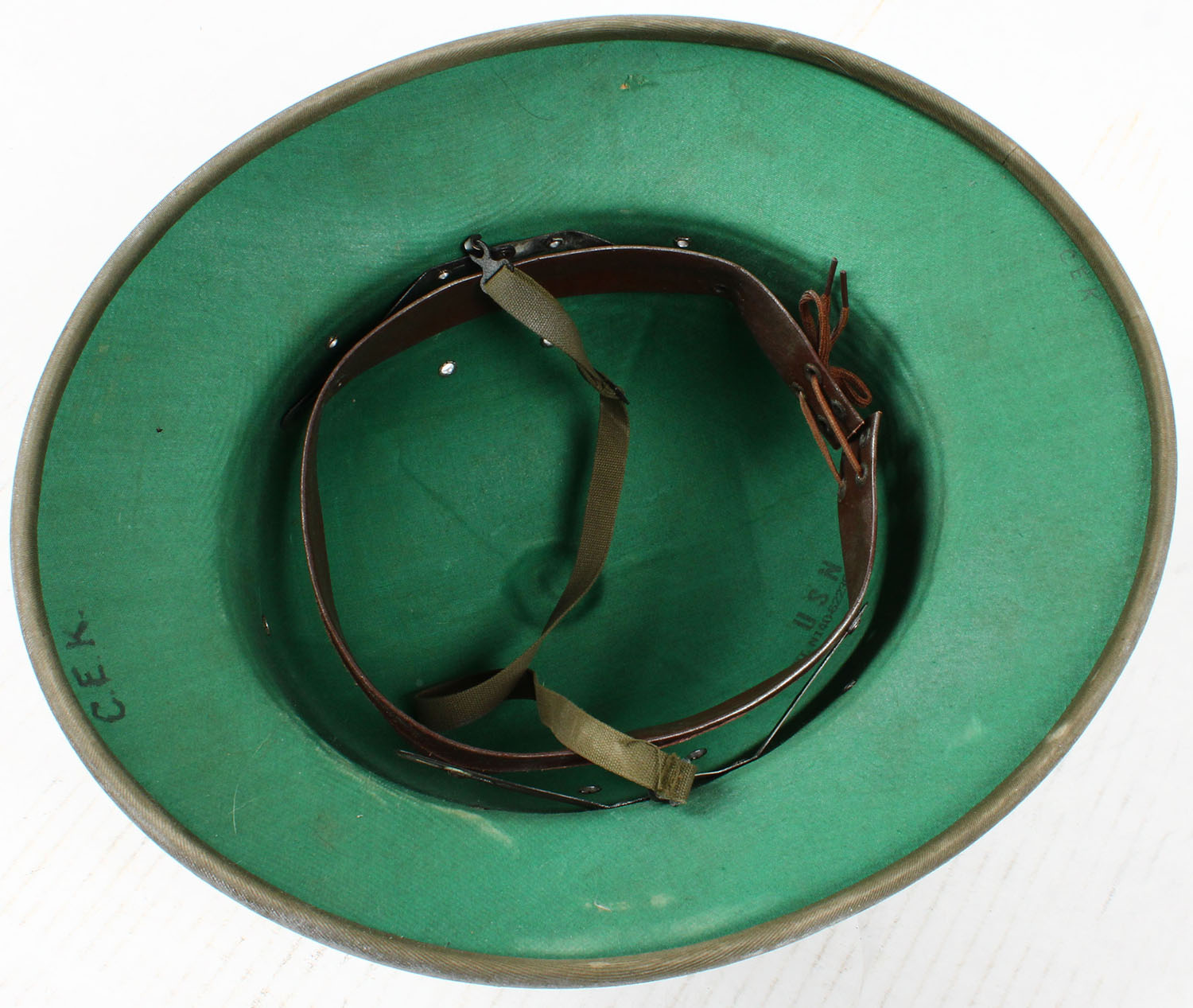 US, 1960's Sun Helmet, Has Liner, Top has scratches, rub marks & Stains, Inside is Marked, ''USN'', ''C.E.K.'', Inside has light sweat stains & light wear. Grade: Very Good ++ - Value: 10 to 60