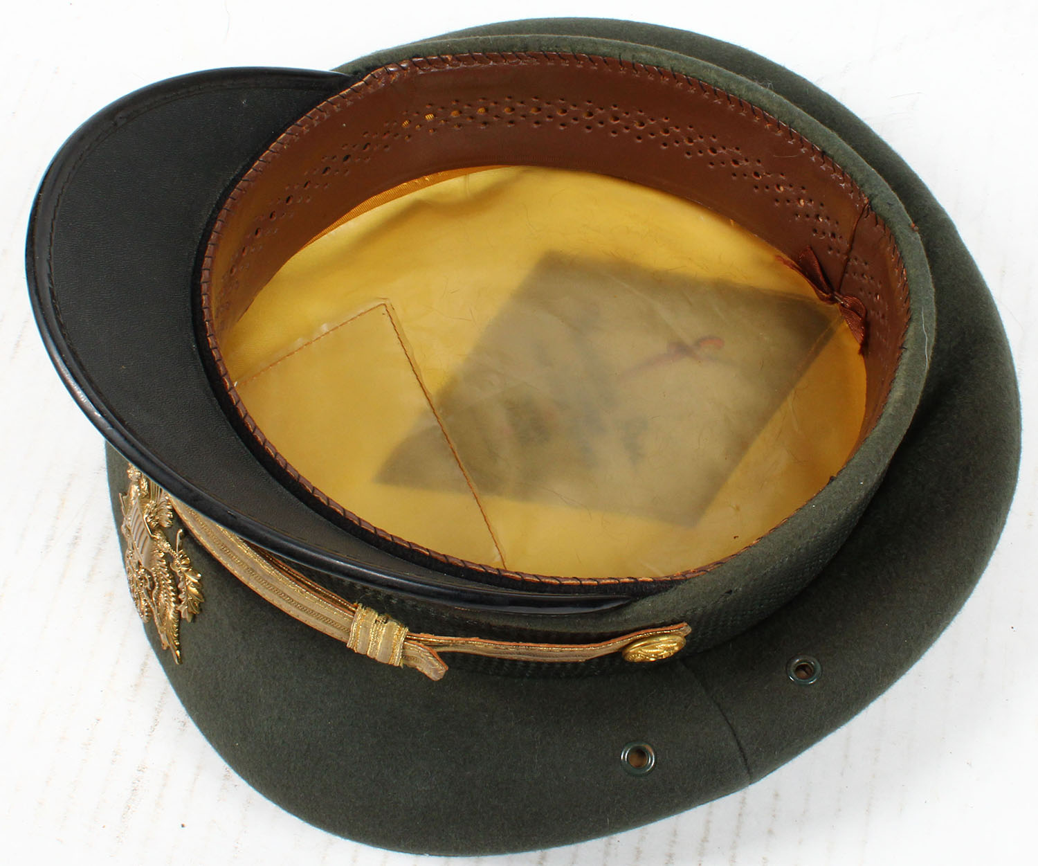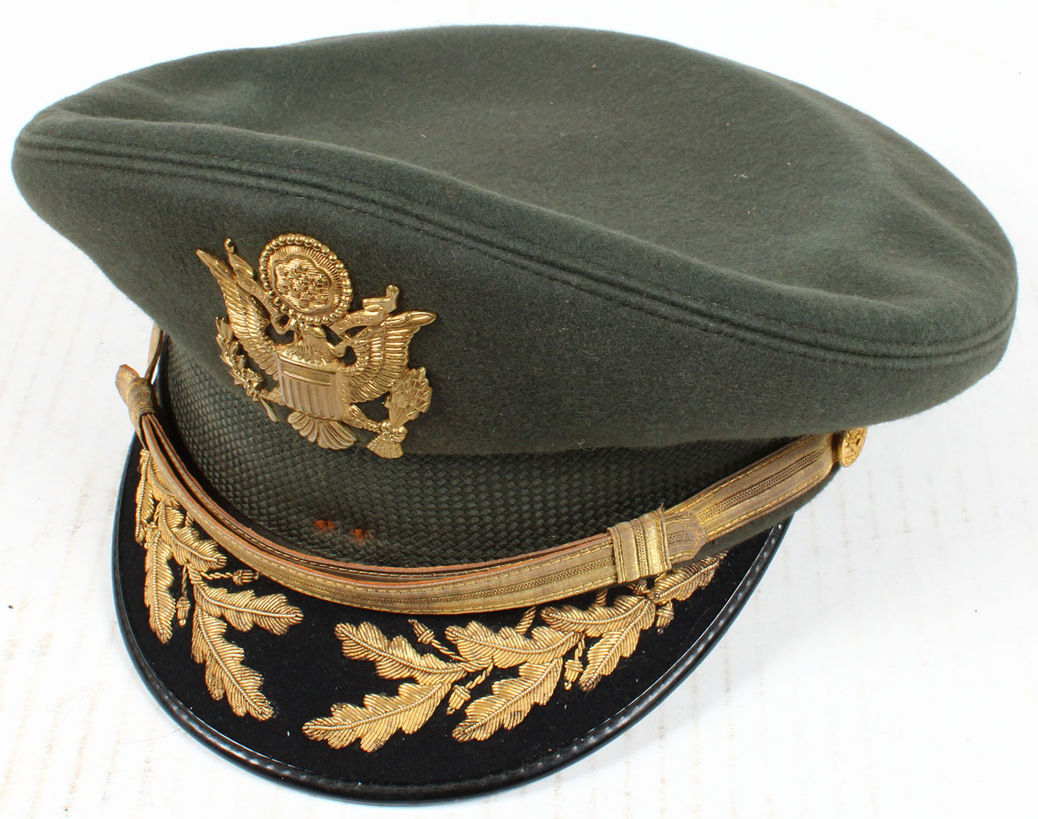 US, US Army Officer Cap, 1960's-70's, Great Seal of the United States on front of hat, Golden Leaf on brim, Inside is marked ''NUDELMAN BROS.'', ''A UNIFORM FOR EVERY PURPOSE'', ''PORTLAND'', ''SEATTLE'', Light rub wear on inside liner. Grade: Excellent + - Value: 20 to 60