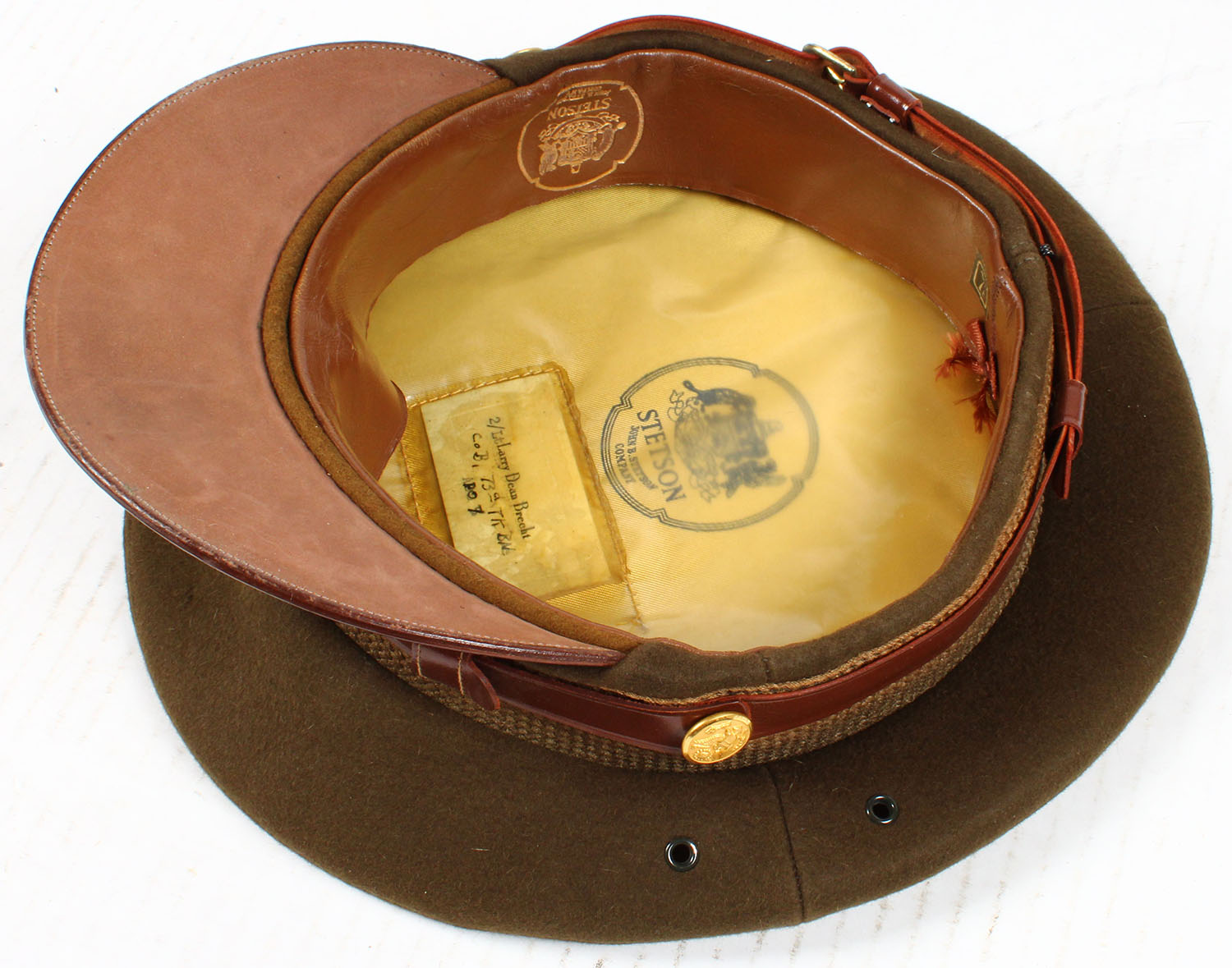 US, WW2 Army Officer Cap, Made By Stetson, cap has light wear, inside of cap marked ''2/LT LARRY DEAN BRECHT CO B 73 D TK BAL PO 7''. Grade: Excellent ++ - Value: 20 to 100
