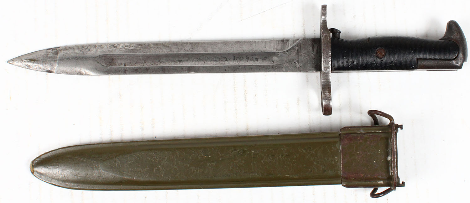 US, M1905 E1 Bayonet, Marked, ''U. C.'', ''U.'' Flaming Bomb ''S.'', sheath has faint warn markings. Grade: Very Good - Value: 50 to 100