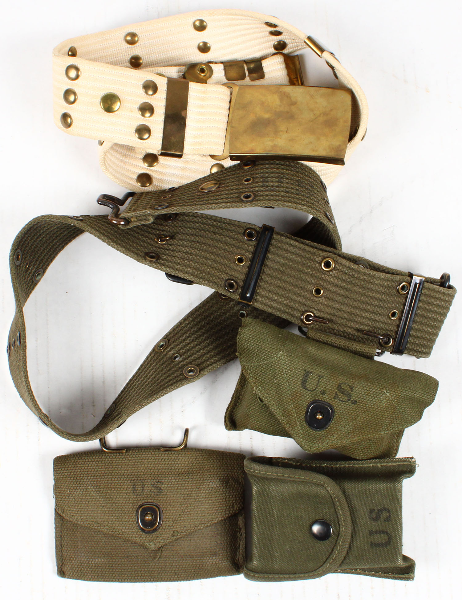 | Lot of five items, two US belts, three US Pouches, two with medi...