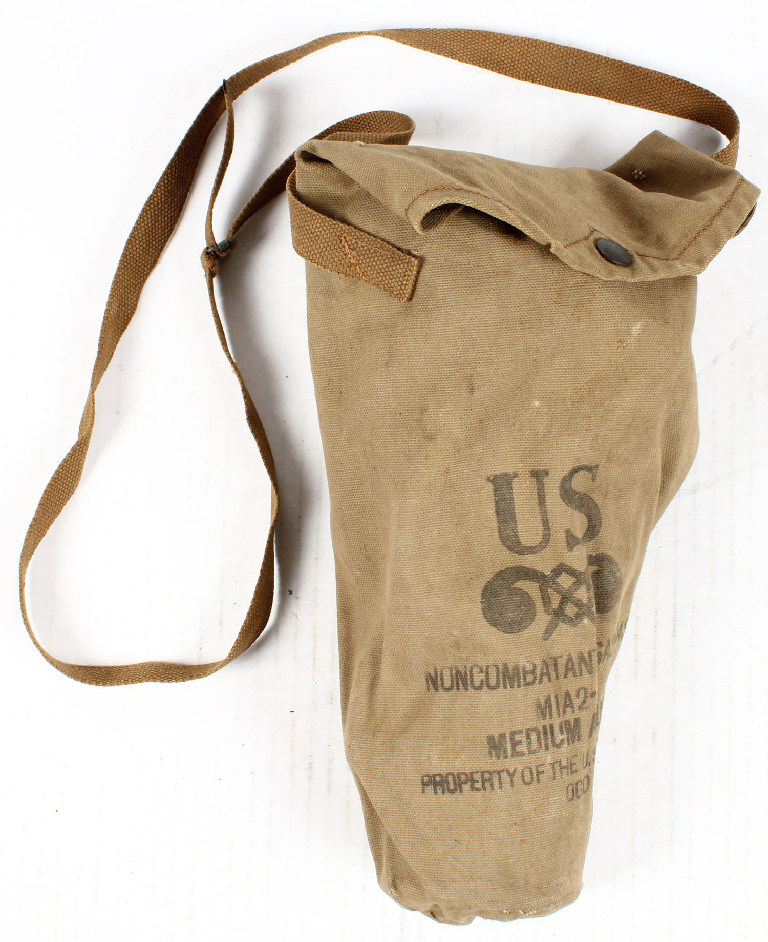 US, M1A2-1-1 Noncombatant Gas Mask, Medium Adult, mask rubber parts are cracked, eyes have turned yellow. Grade: Very Good + - Value: 10 to 100