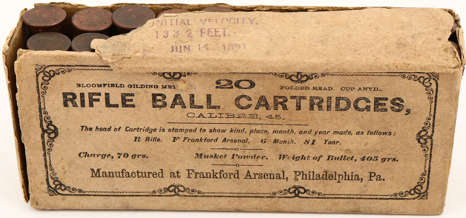 Frankford Arsenal, .45 Calibre, 70 Grs of powder, 405 Grs Bullet, 1pc, Full, buff box & label with black print, box has multiple split seams, missing top of box, light age soiling, rub marks & edge wear, ammo is very good. (1385) Grade: Very Good + - Value: 30 to 120