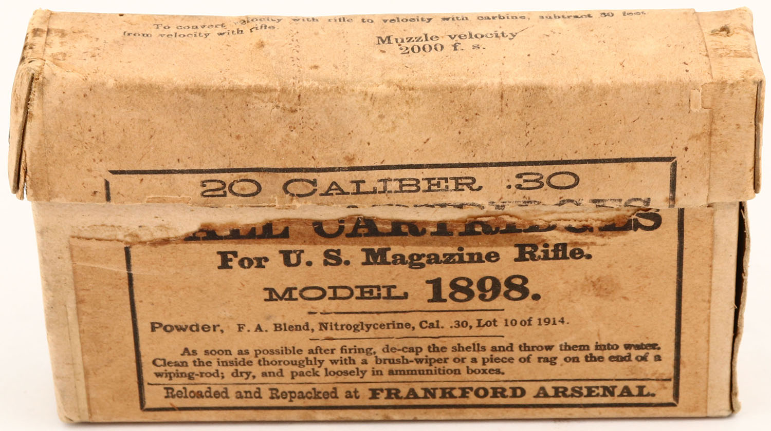 Frankford Arsenal, .30 Ball Model 1898, 2pc, Full, buff box & label with black print, box is solid with light age soiling & handling wear, ammo is very good with cracks at necks on most Rds.. Grade: Excellent - Value: 20 to 40