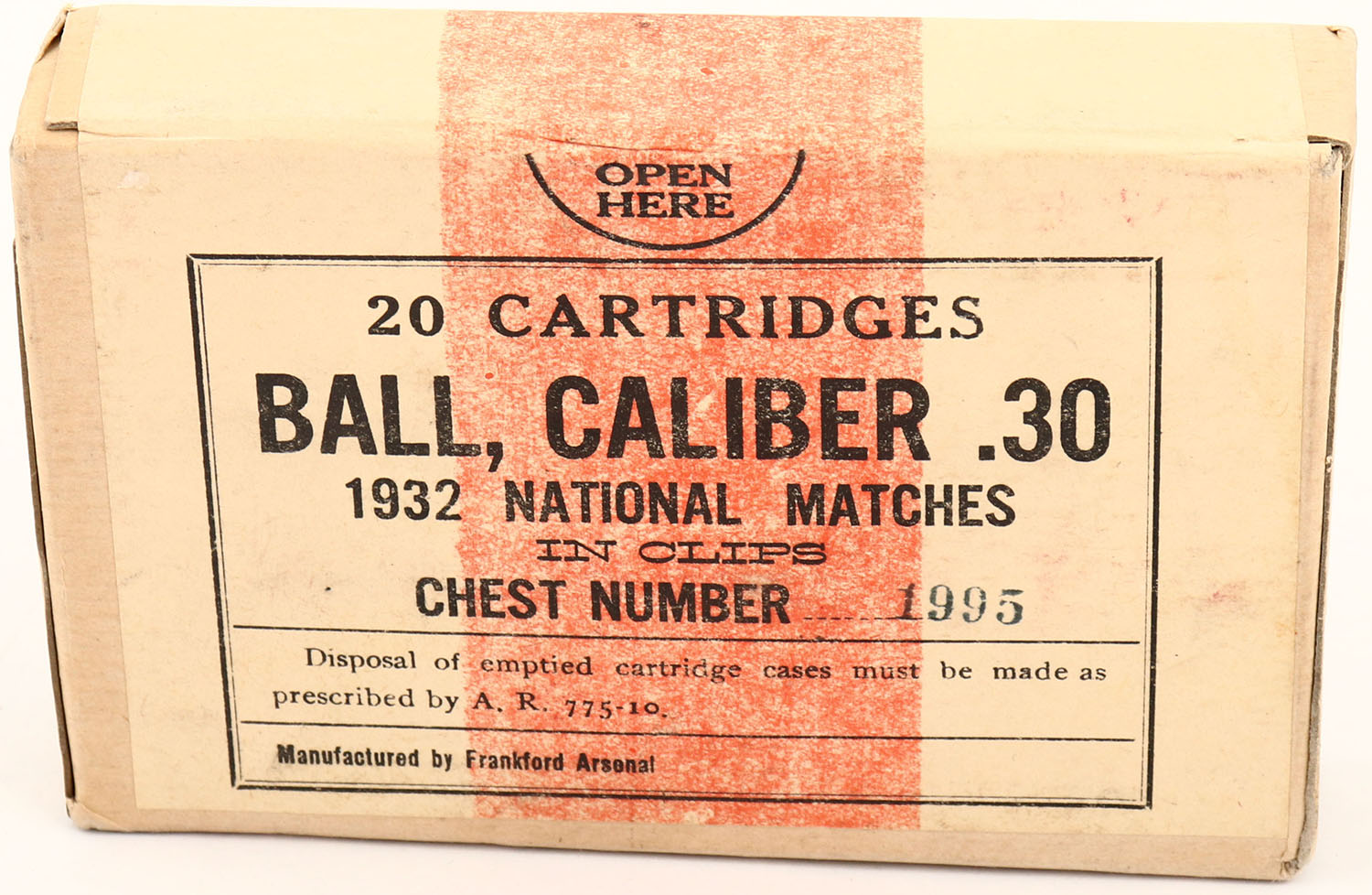 Frankford Arsenal, .30 Ball, 1932 National Matches, In Clips, Chest Number 1995, 1pc, FULL & SEALED, buff box with buff/red label & black print, box is solid with light rub wear. Grade: Excellent ++ - Value: 20 to 40