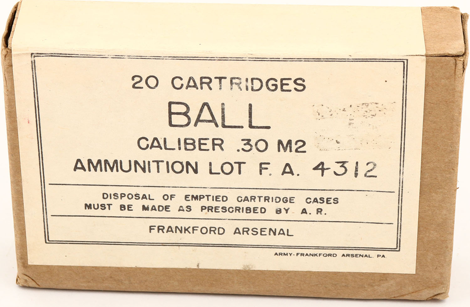 Frankford Arsenal, .30 M2 Ball, Lot F. A. 4312, 1pc, FULL & SEALED, buff box with white label & black print, box is solid with sticker mark on front label & light wear. Grade: Excellent + - Value: 20 to 40