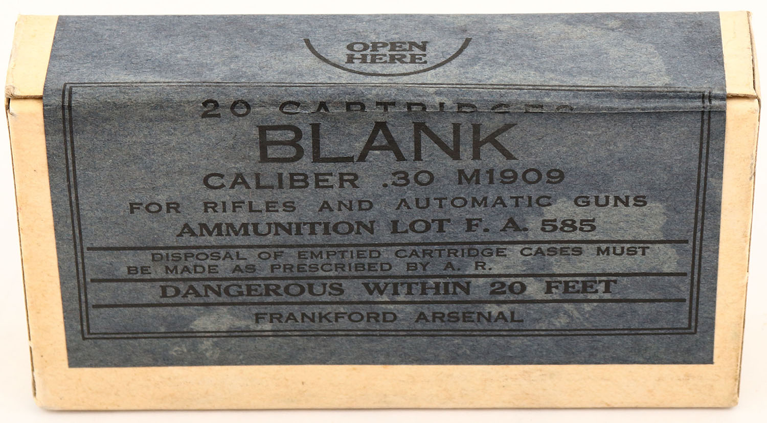 Frankford Arsenal, .30 M1909 (30-06), BLANK, Lot F. A. 585, 1pc, FULL & SEALED, buff box with gray label & black print, box is solid with pencil marks on bottom & light rub wear. Grade: Excellent ++ - Value: 10 to 30