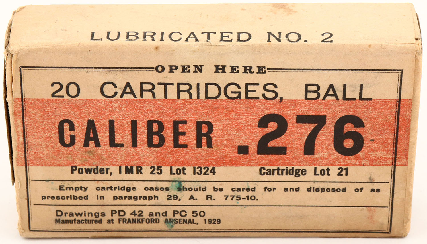 Frankford Arsenal, .276, Lot 21, 1pc, Sealed but hole inside with two Rds. Missing, 18 Rds. Total, buff bx with buff/orange label & black print, box has hole on left end, partial split seam on bottom, light age soiling, light rub wear & light edge wear. (462) Grade: Very Good ++ - Value: 20 to 40