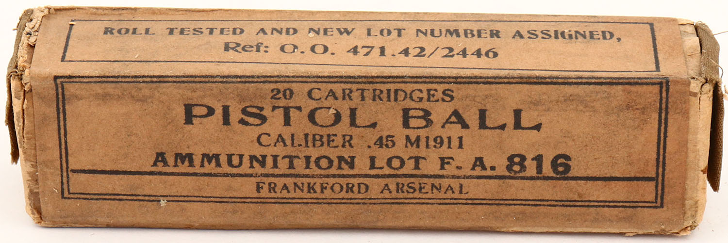 Frankford Arsenal, .45 M1911 Pistol Ball, Lot F.A. 816, 1pc, FULL & SEALED, buff box & label & black print, box is solid with light age soiling. Grade: Excellent - Value: 10 to 30