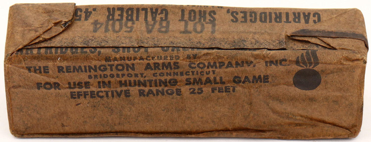 Remington, .45 SHOT Cartridges, M15, Lot RA 5014, 1pc, FULL & SEALED, brown foil with black print, foil/box is solid with age soiling & light rub wear. Grade: Excellent - Value: 20 to 100