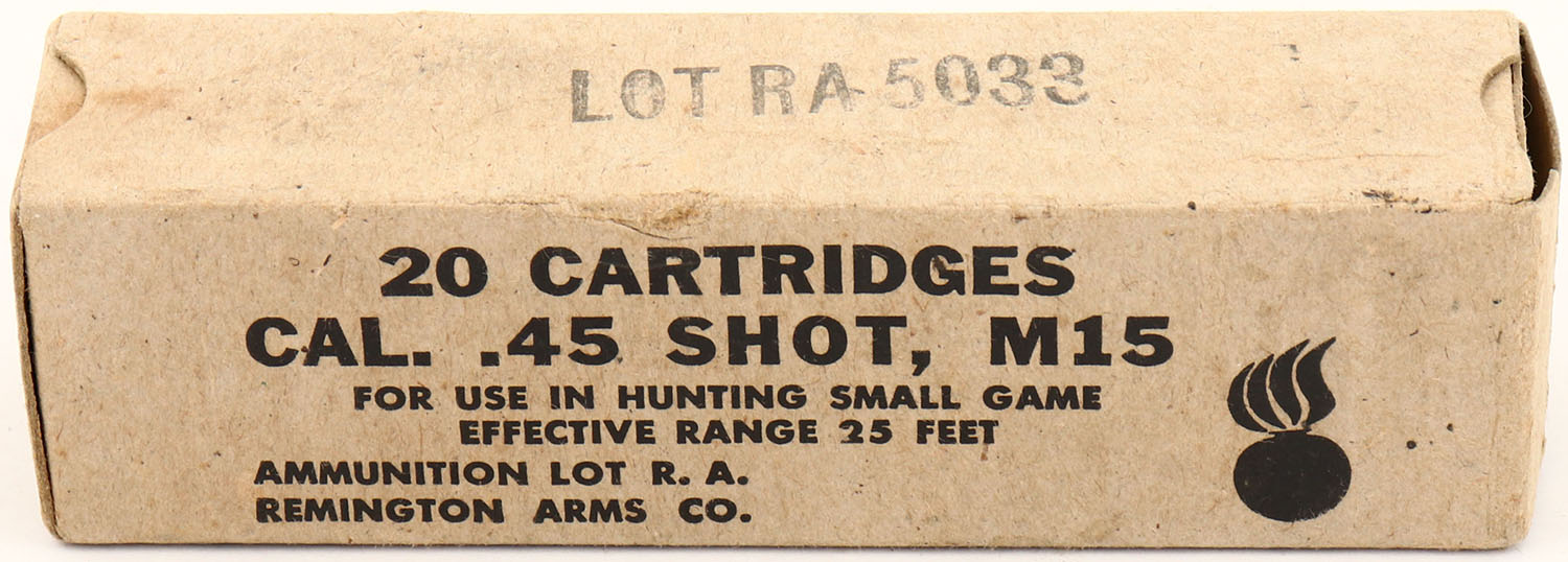 Remington, .45 Shot M15, Lot RA 5033, 1pc, Full, buff box & black print, box is solid with light age soiling, rub wear & light edge wear, ammo is very good. (1523) Grade: Very Good ++ - Value: 20 to 100