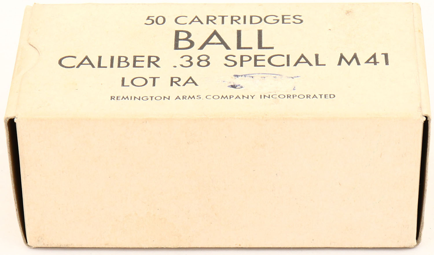 Remington, .38 Special M41 Ball, 1pc, Full, buff box with black print, box is solid with lot number scratched out from front label, light age soiling & light rub wear, ammo is Very Good. (139) Grade: Excellent - Value: 10 to 30