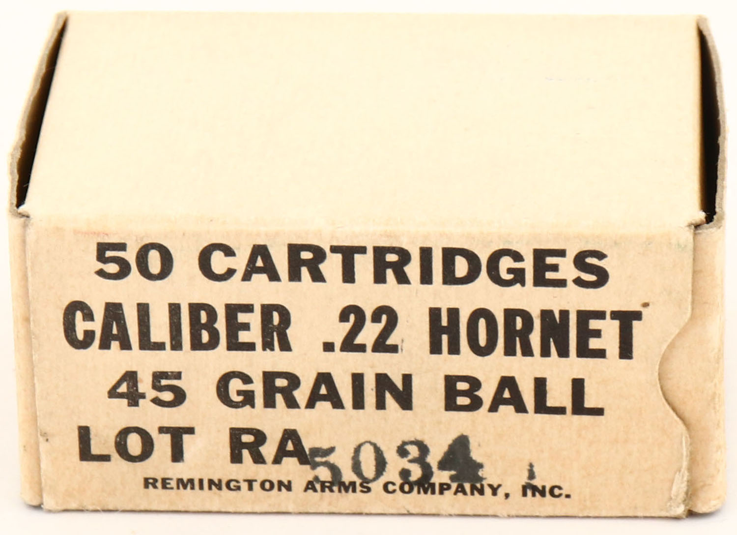 Remington, .22 Hornet, .45 Gr. Ball, Lot RA5034, 1pc, Full, buff box with black print, box is solid with pen marks on end, light rub marks & light wear, ammo is very good. Grade: Excellent - Value: 20 to 60