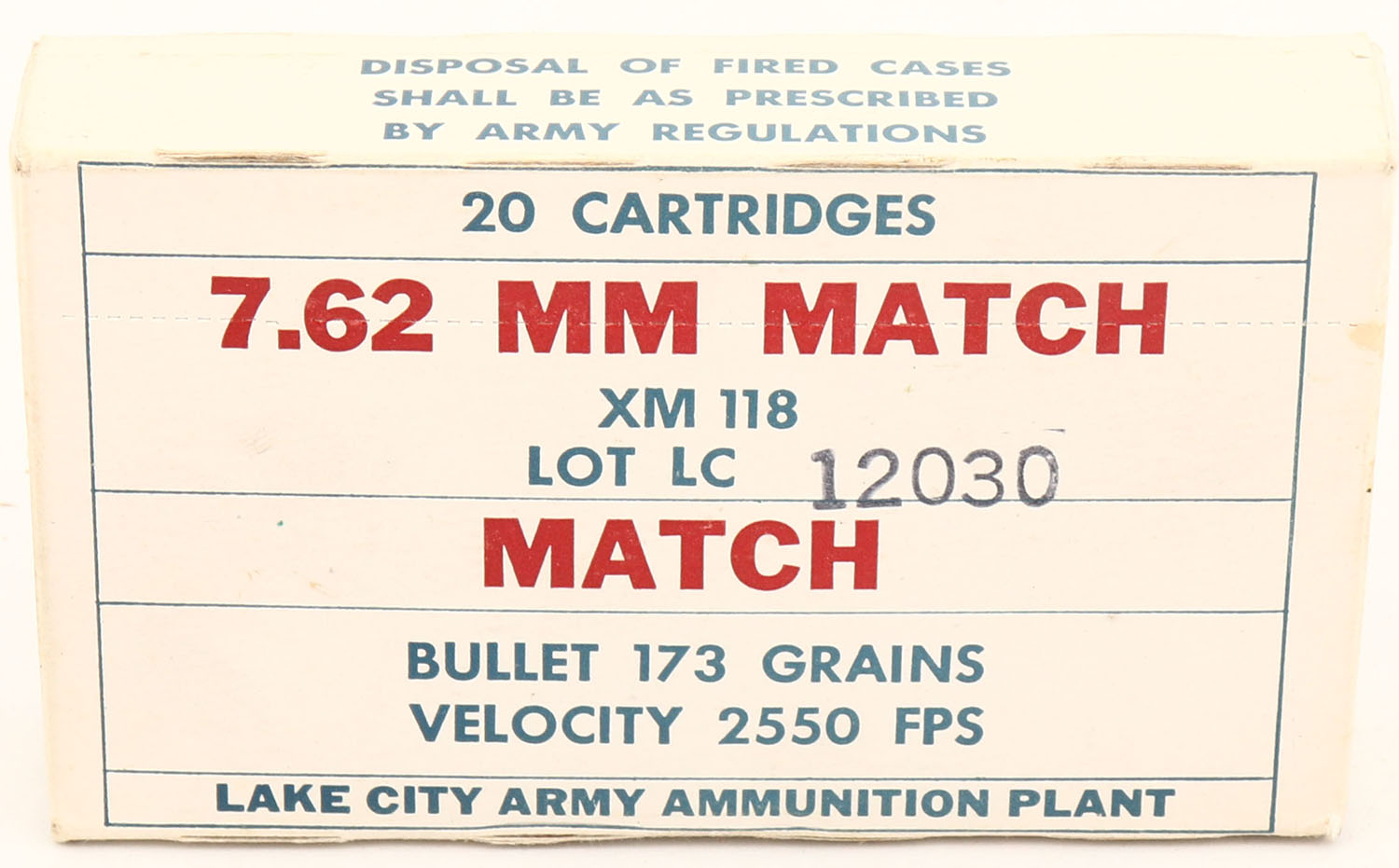 Lake City, 7.62 MM Match, XM 118, Lot LC 12030, 173 Gr. Bullet, 1964 Dated, 1pc, FULL & SEALED, white box & label with blue/red print, box is solid with pencil marks, stains & rub wear. (1483) Grade: Excellent - Value: 20 to 40