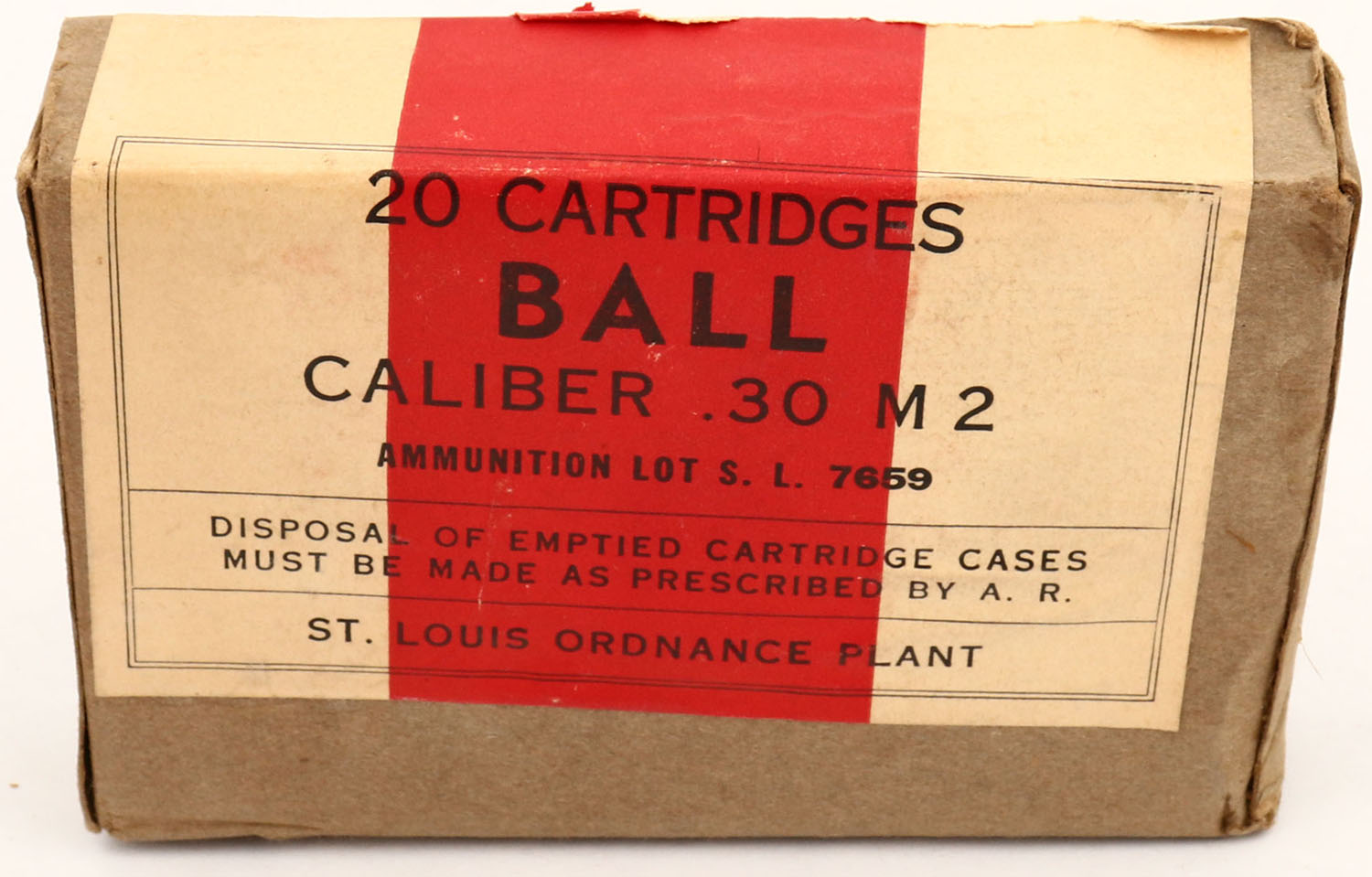 ST. Louis, .30 M2 Ball, Lot S. L. 7659, 1pc, Full, buff box with buff/red label & black print, box is solid with wear/holes from bullets on bottom, handling wear, light rub wear & light edge wear, ammo is very good. Grade: Very Good ++ - Value: 20 to 40