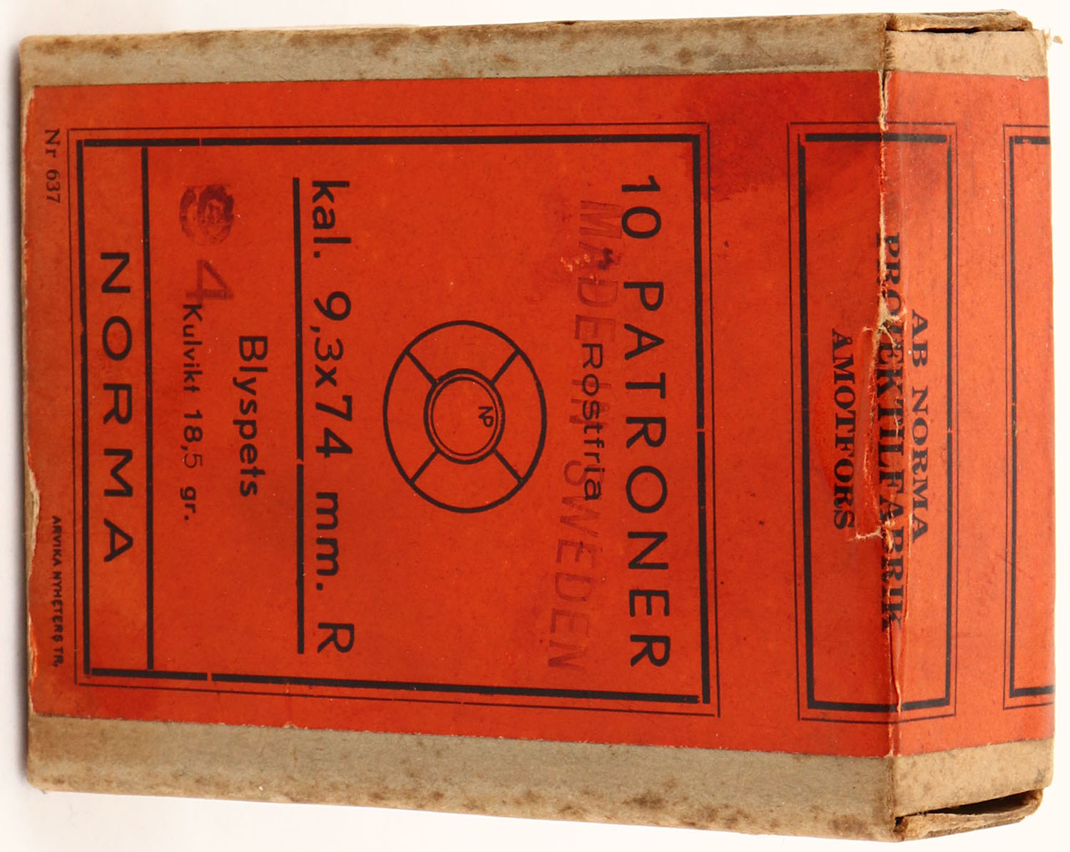 Norma, 9.34 x 74mmR, 1pc, FULL & SEALED, buff box with red label & black print, box is solid with light age soiling, pen marks, light rub marks & light edge wear. (1284) Grade: Excellent + - Value: 10 to 100