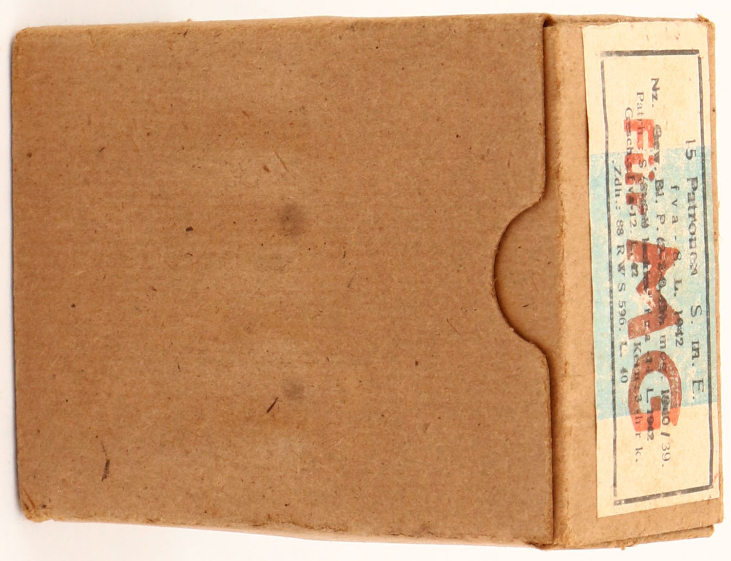 German, 7.92x57mm Steel case For MG, 1pc, Full, buff box with buff/blue label & black/red print, box is solid with rub marks & light edge wear, ammo is very good. (1433) Grade: Excellent - Value: 10 to 30