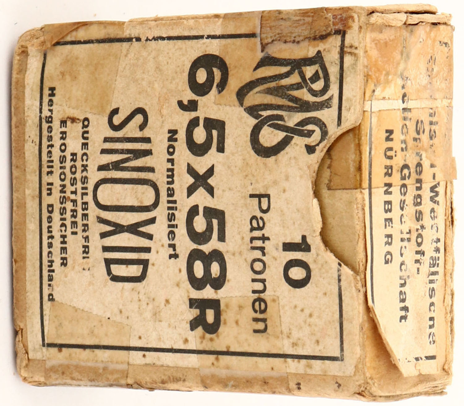 Sinoxid, 6.5x58mmR, 1pc, Full, buff box & label with black print, box has tape repairs, partial tear of seam of top flap, age soiling, rub marks & edge wear, ammo is very good. (1238) Grade: Very Good - Value: 10 to 30