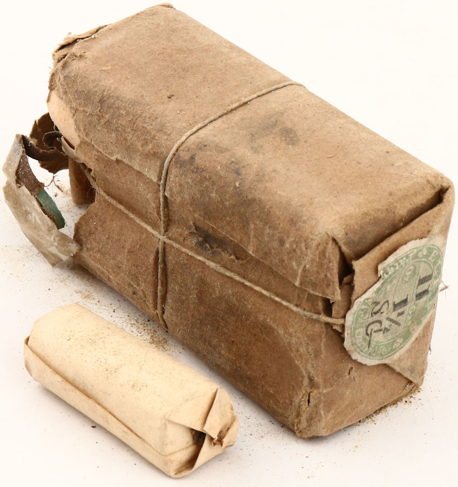 ELEY, 11 Ga Paper cartridges, 1 1/2 Oz, pouch, Full one Rd. has been opened, buff paper with green label & black print, pouch has hole torn on bottom, age soiling & rub marks, ammo is very good. Grade: Very Good + - Value: 10 to 100