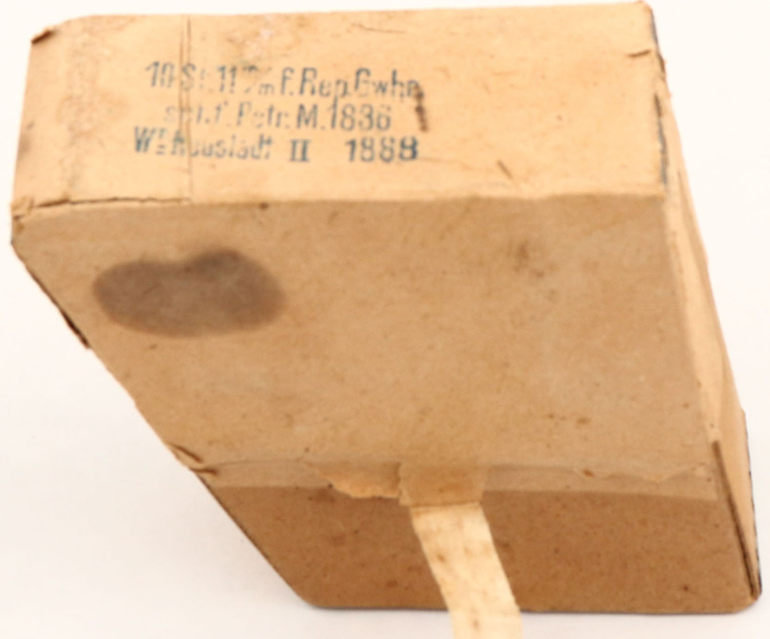 Austrian 11x58mmR in clips, 2pc, Full, buff box with blue print, box is solid with light age soiling/stains, rub marks & edge wear, ammo is good. (692) Grade: Excellent - Value: 10 to 100