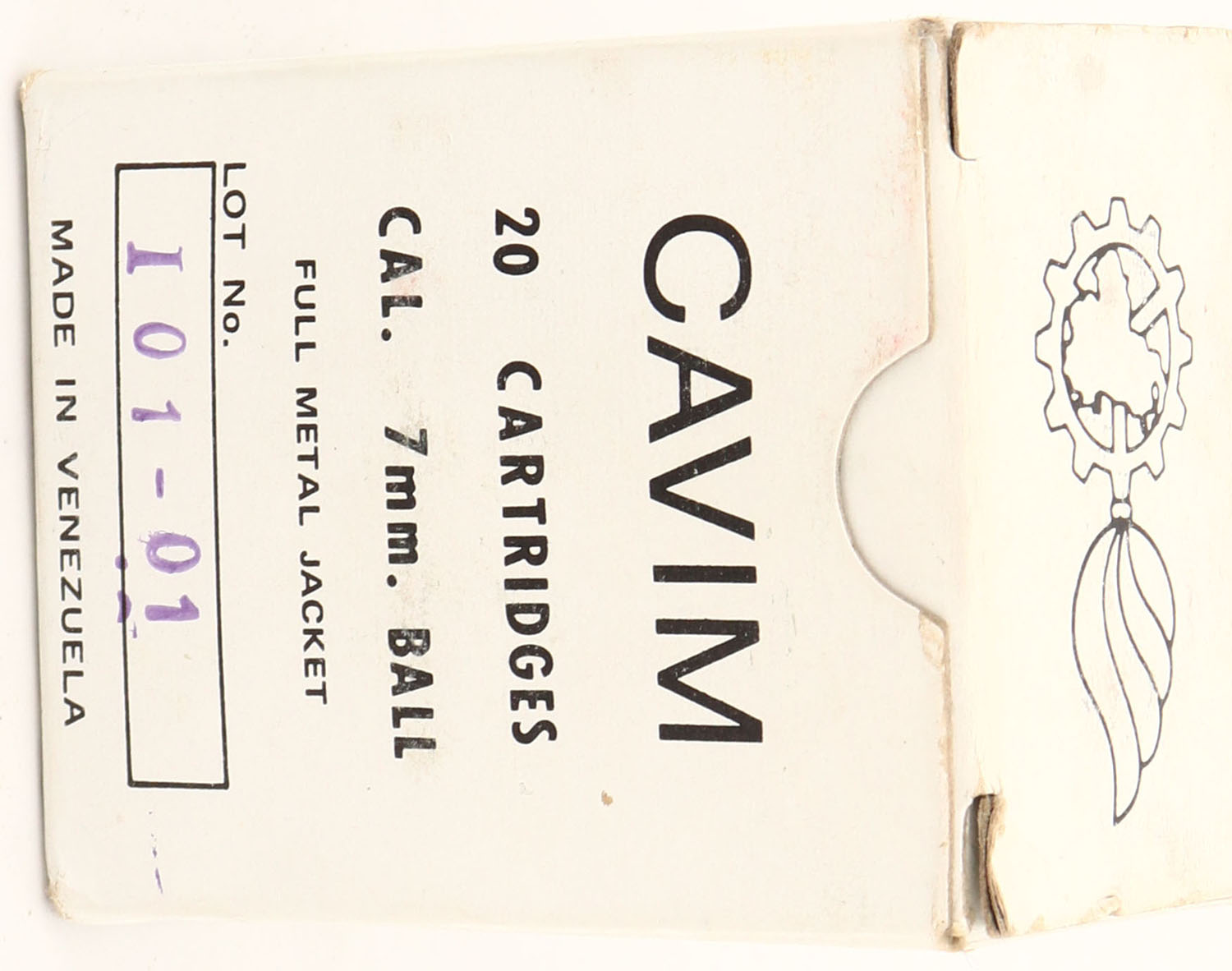 Cavim, 7mm Ball, FMJ, 1pc, Full, white box with black print, box is solid with light age soiling, light rub marks & light edge wear, ammo is very good. Grade: Excellent - Value: 10 to 30