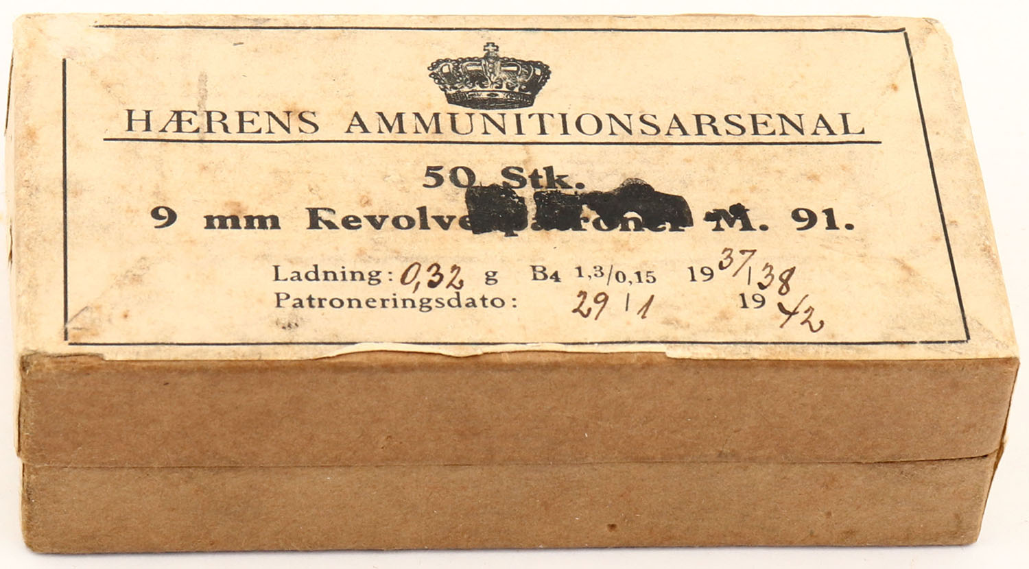 Haerens Ammunitions arsenal, 9mm Revolver, 2pc, Full, buff box & label with black print, box is solid with light age soiling, light rub marks & light edge wear, ammo is very good with factory grease. (1255) Grade: Excellent - Value: 10 to 50