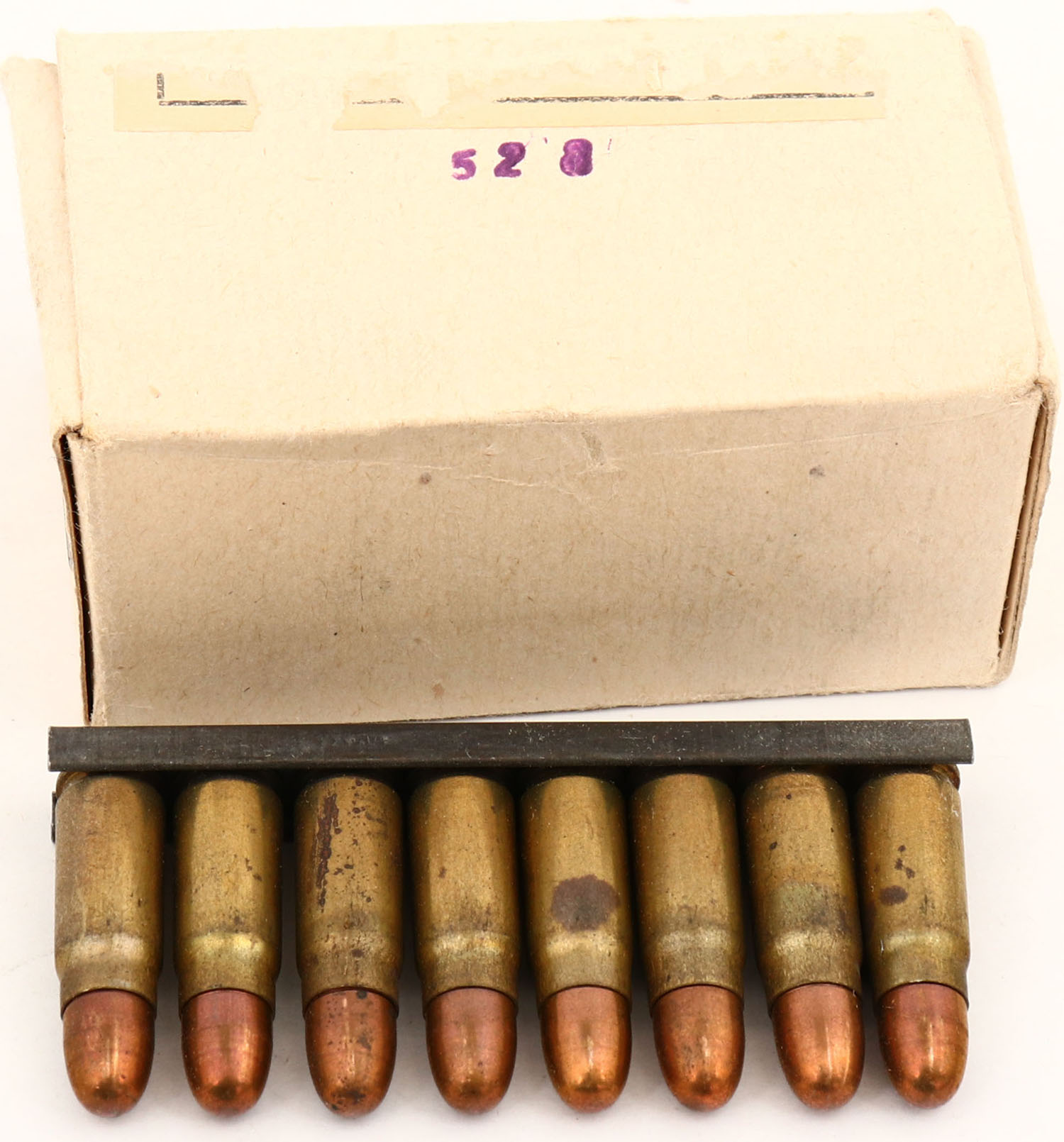 Czech, 7.62 Tokarev on clips, 1pc, Full, buff box with buff label & black print, box is solid with label torn off, handling wear, rub marks & edge wear, ammo is Very Good. Grade: Very Good + - Value: 10 to 30
