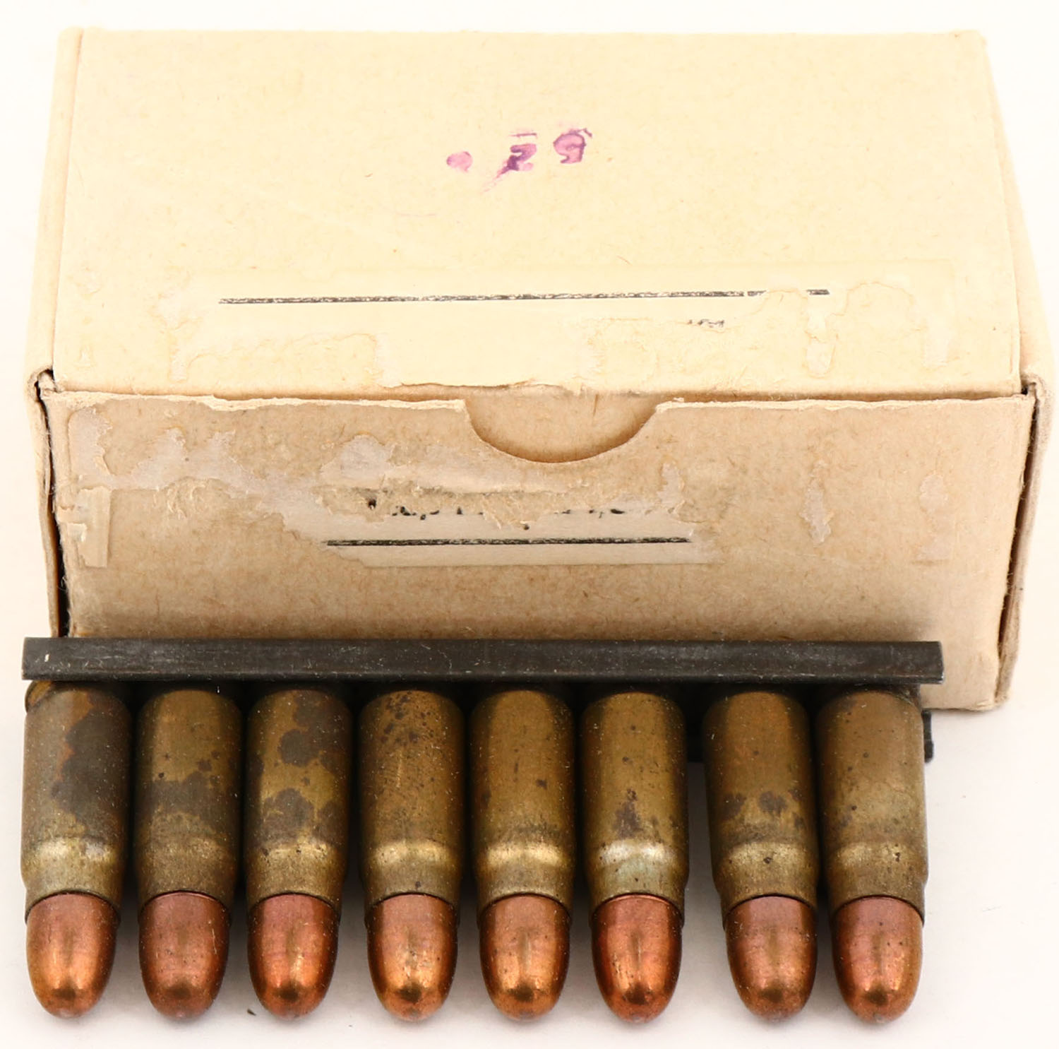 Czech, 7.62 Tokarev on clips, 1pc, Full, buff box with buff label & black print, box is solid with label torn off, handling wear, rub marks & edge wear, ammo is Very Good. Grade: Very Good + - Value: 10 to 30