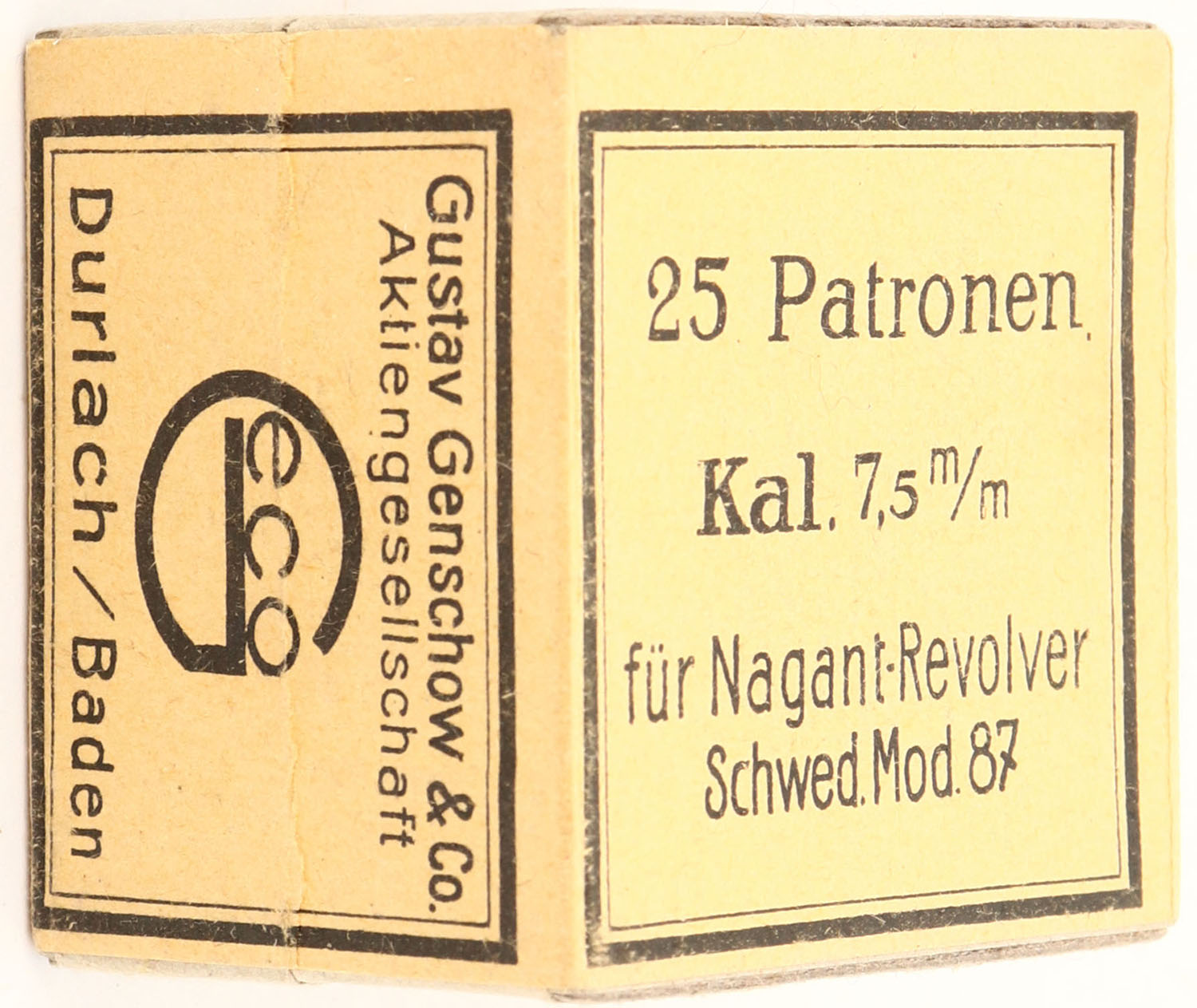German, 7.5 x 23mmR model 1882 Ordnance, 2pc, Partial 15 Rds., buff box & label with black print, box is solid with light wear, ammo is very good. (544) Grade: Excellent ++ - Value: 10 to 100