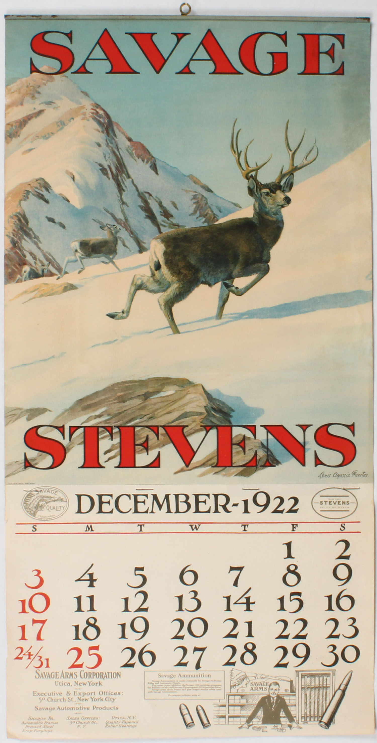1922 Savage- Stevens Arms Co. Calendar by Louis Agassiz Fuertes, near perfect full color image of mule deer in snow mountain scene, has brass band and hanger on top, wonderful condition, all original, Dec. Page, 14 1/4'' x 28'', very collectible & hard to find. Grade: Excellent ++ - Value: 1500 to 3000