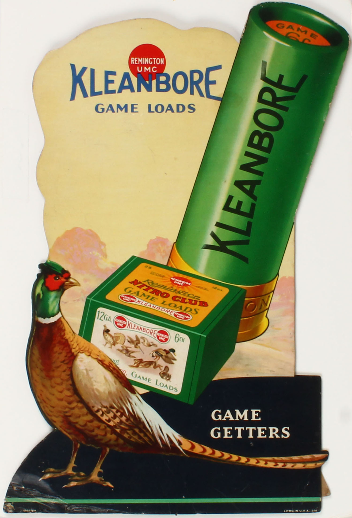 Remington Nitro Club Game Loads, Kleanbore Diecut of rooster pheasant with 2pc shotshell box & large green shotshell, has easel back, has great colors, one corner ding otherwise near mint, 13'' x 19''. Grade: Excellent - Value: 800 to 1500
