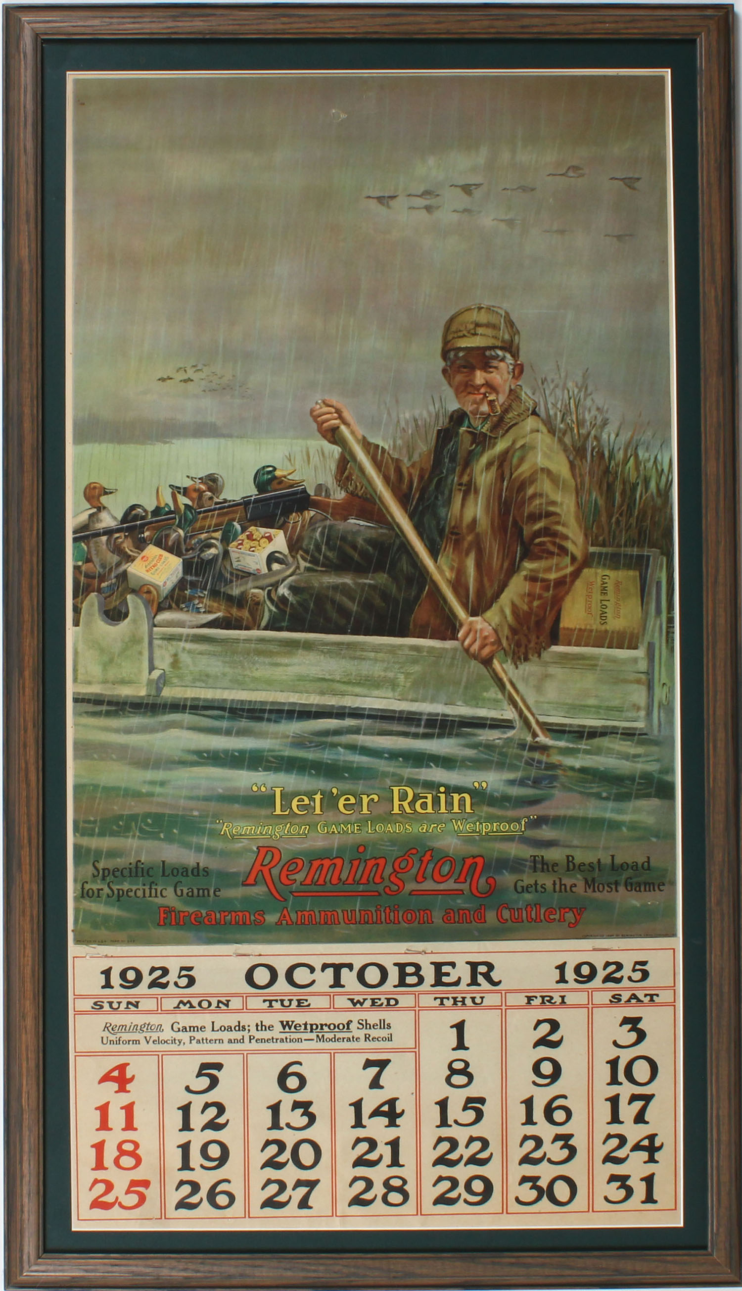 1925 Remington ''LER'ER RAIN'' Calendar, pictures duck hunter in duck boat with decoys, 2pc. Shotshell boxes & an Auto loader, 15'' x 28 1/2'''', metal band on top with brass hanger, Oct. Page, has one small tear to top center otherwise near mint, wonderful colors, great duck hunting image, framed. Grade: Excellent + - Value: 3000 to 6000