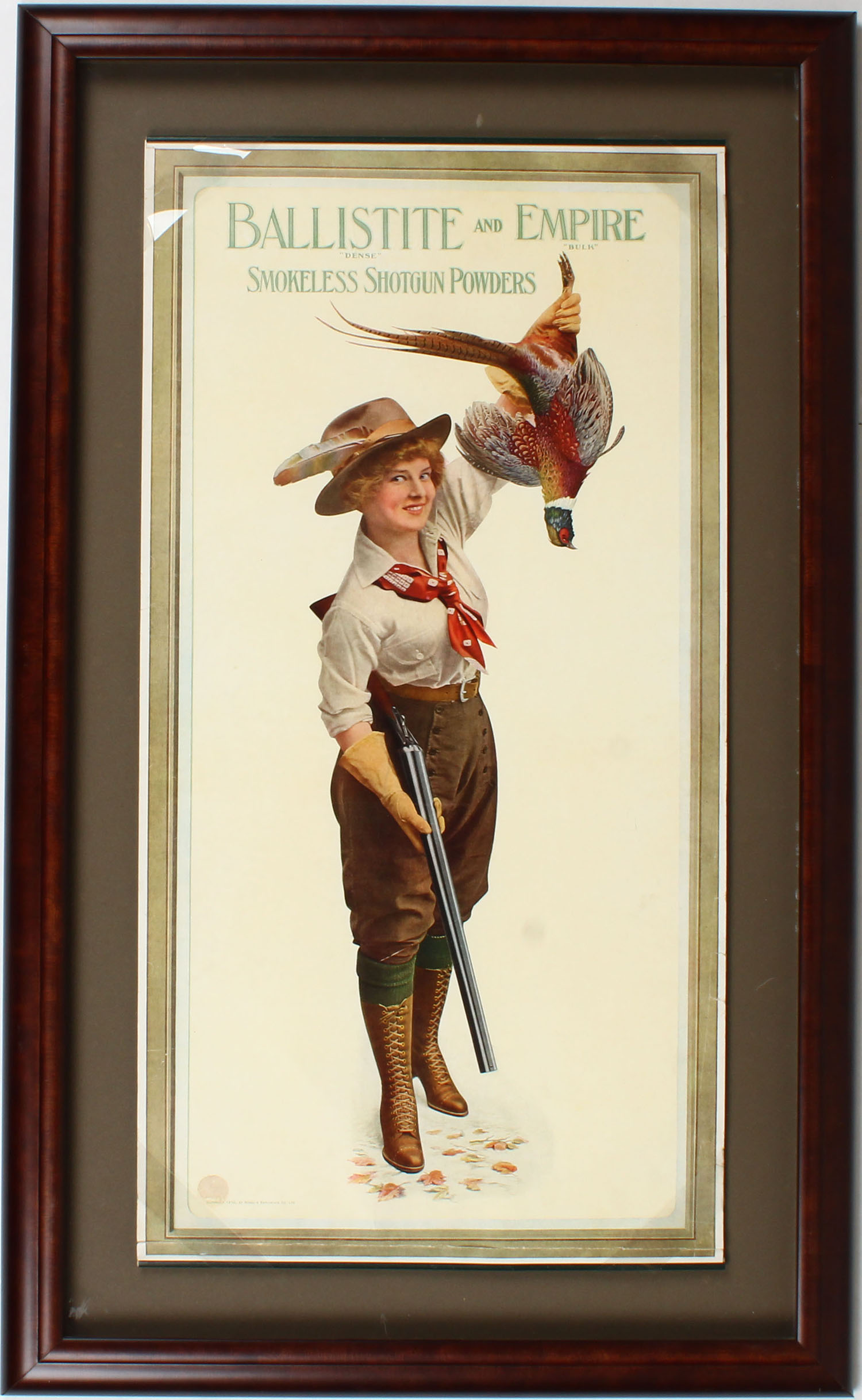 RARE 1910 Ballistite and Empire Smokeless Shotgun Powders Poster, excellent multi colored image of lady holding a double shotgun with beautiful rooster pheasant, bands top & bottom with brass hanger, 13 3/4'' x 26 1/2'', unknown artist, all original with wonderful colors, one spot to bottom left, framed, Very sought after poster! Grade: Excellent + - Value: 1000 to 4000