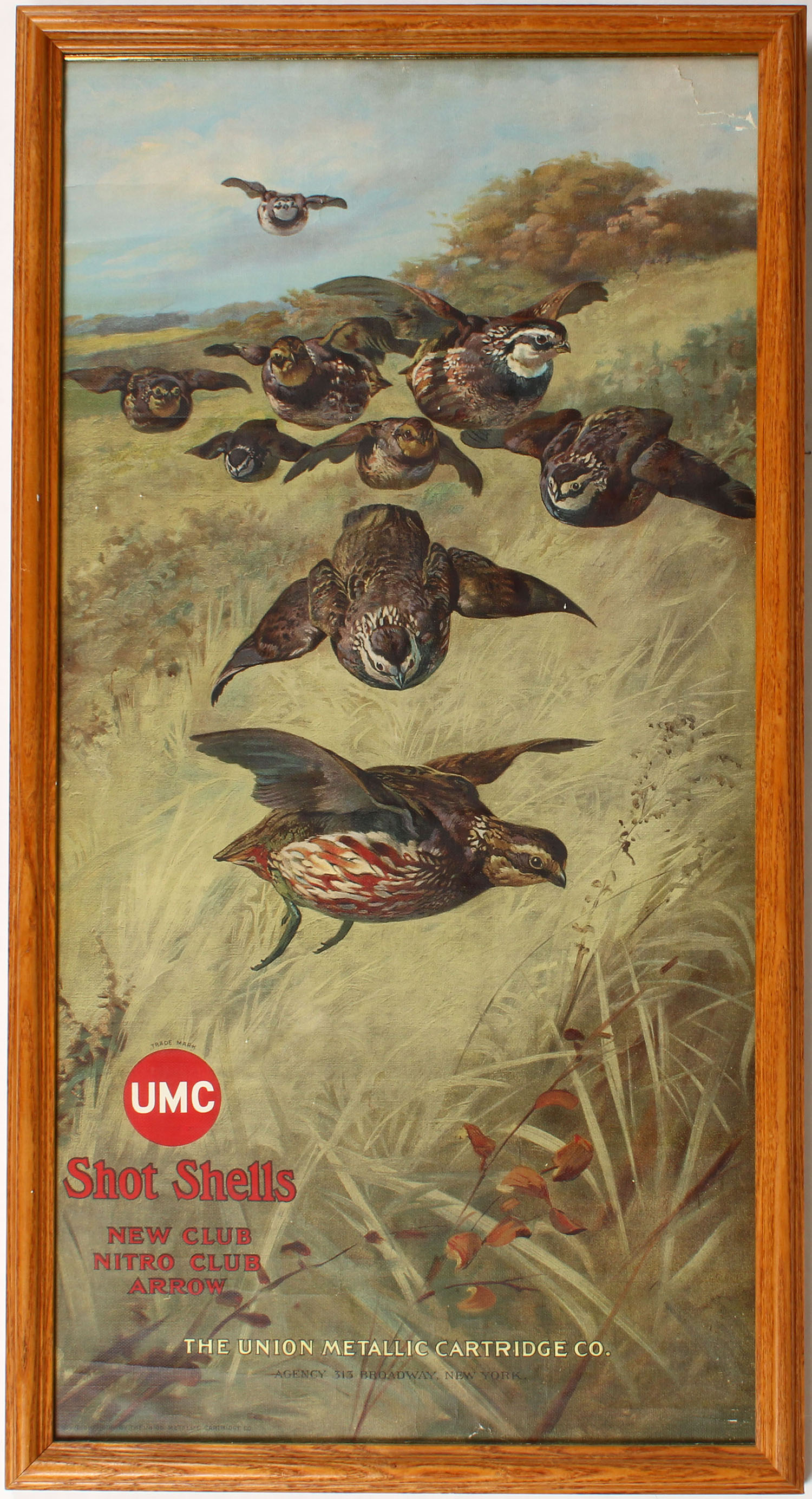 UMC SHOT SHELLS POSTER, ''NEW CLUB, NITRO CLUB, ARROW'', near perfect full color image of Covey of Quail in flight coming right at you, has bands top & bottom with brass hanger, has a tear to top left & to bottom center, 15'' x 29 1/4'', framed, EXTREMELY RARE! Grade: Excellent - Value: 1000 to 3000