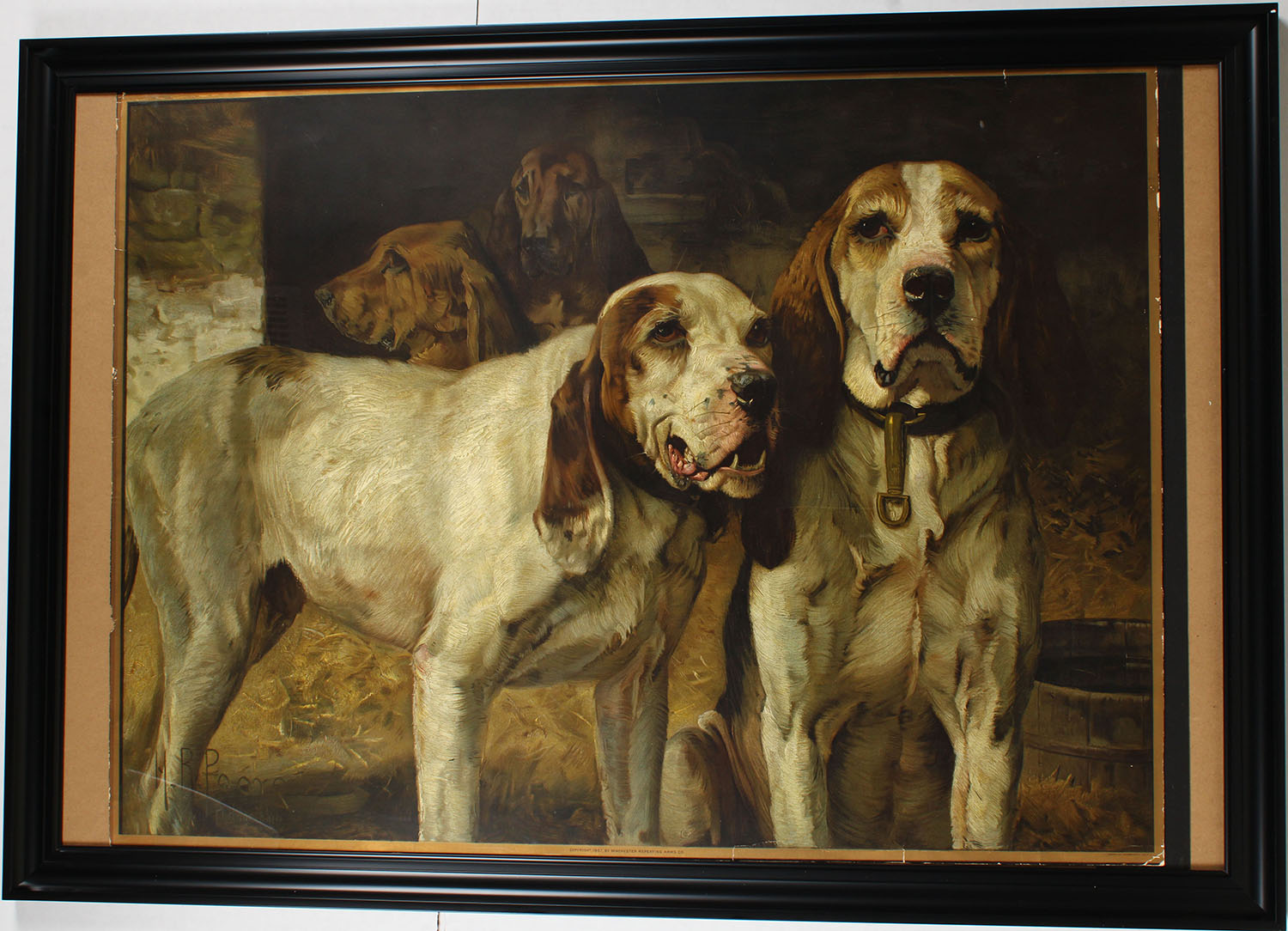 1907 Winchester BEAR DOGS, poster by H. R. Poers, has great colors & is very bright, 35 1/2'' x 26 1/2'', framed, has very light edge wear, Rare & hard to find in this nice bright condition. Grade: Excellent - Value: 500 to 1500