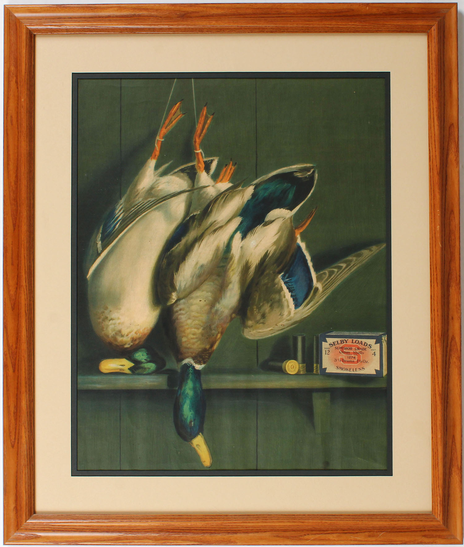 1916 SELBY Calendar top by Alexander Pope, near perfect full color image of green head mallards, Selby Loads 2pc shotshell box with green duck blind background, no bands, wonderful condition, 17'' x 23'', framed, very collectible & hard to find. Grade: Excellent - Value: 400 to 800