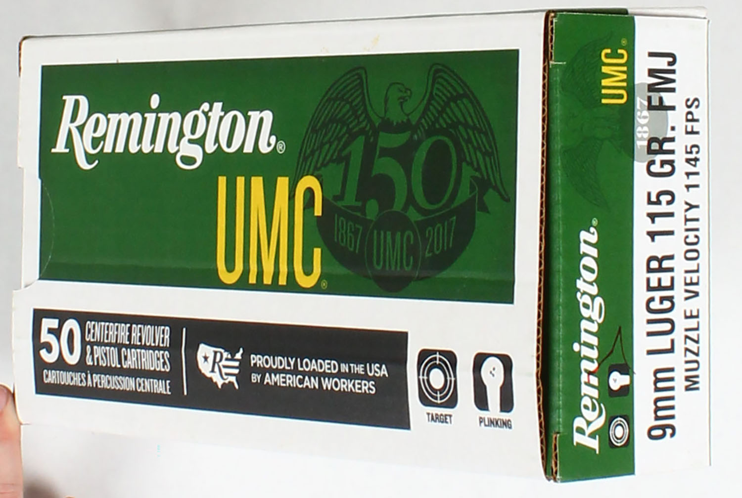 Remington 3D 9mm Luger 115 GR. FMJ, counter display diecut, 14'' x 7'' x 3 1/2''. Grade: MINT - Value: 10 to 50