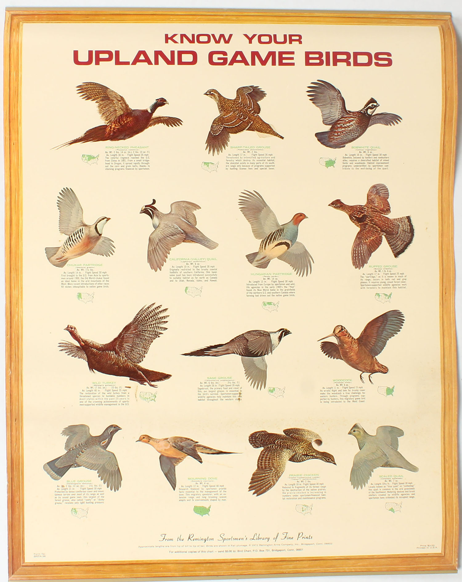 Large Remington Peters KNOW YOUR UPLAND GAME BIRDS poster, great colors, size 22'' x 29'', has bands top & bottom with hanger. Grade: Excellent - Value: 30 to 150