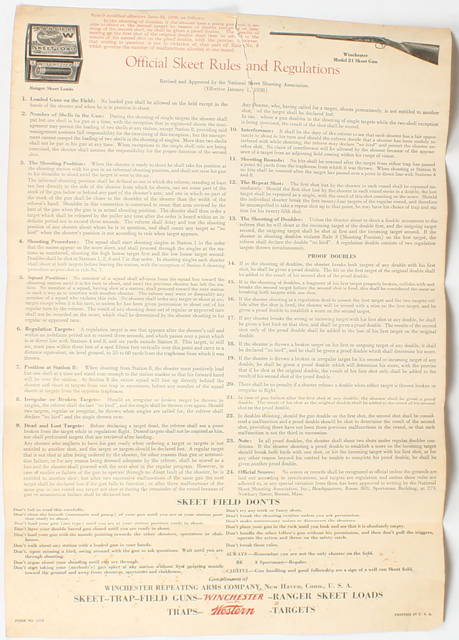 Winchester-Western Official Skeet Rules & Regulations for the 1938 National Skeet Shoot, has great image of Ranger Skeet Load shotshell box at top with Winchester Model 21 Skeet Gun, 15'' x 22'', has two tear to top. Grade: Very Good ++ - Value: 10 to 100
