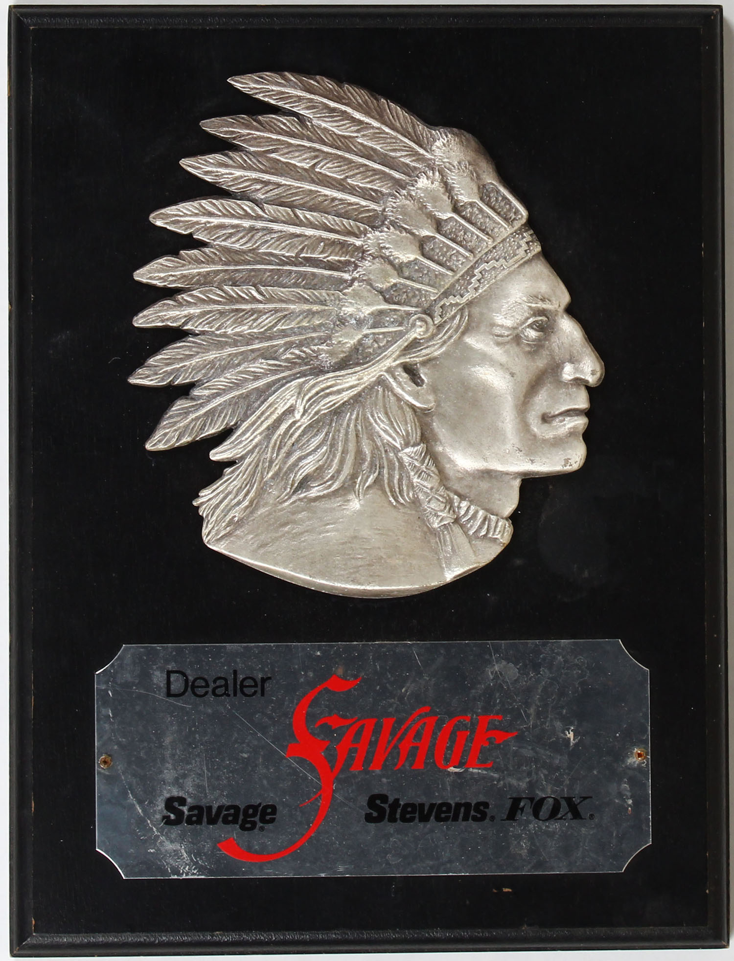 Savage Stevens Fox Dealer plaque, 9'' x 12''. Grade: Excellent + - Value: 50 to 250