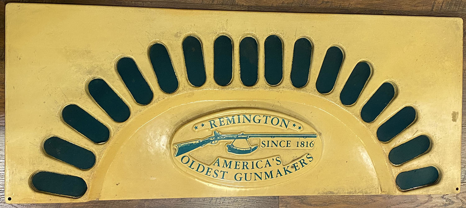 Remington Gun Display case base, plastic base has Logo impressed with decals & felt for gun stocks, 46'' x 19''. Shows some wear, would make for a nice display in your gun cabinet. Grade: Very Good - Value: 50 to 150