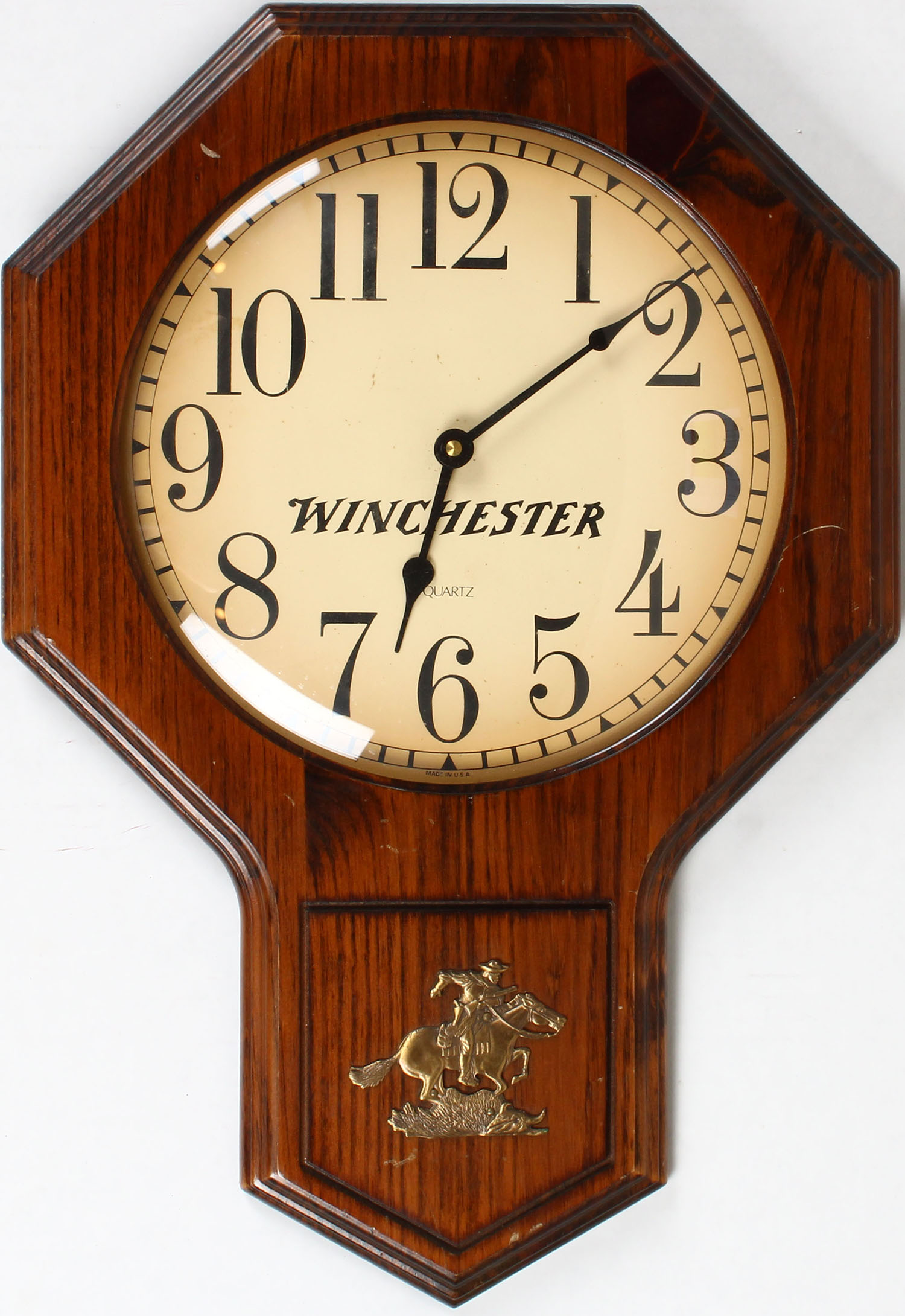 Winchester Wall Clock, Quartz, battery operated, some age soiling to numbers, 13'' x 20''. Grade: Very Good ++ - Value: 20 to 200