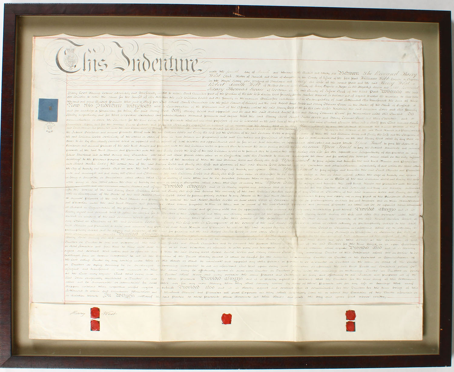 1835 Framed Indenture Henry West on parchment paper, has 5 wax seals, 31'' x 24''. Grade: Excellent - Value: 200 to 2000