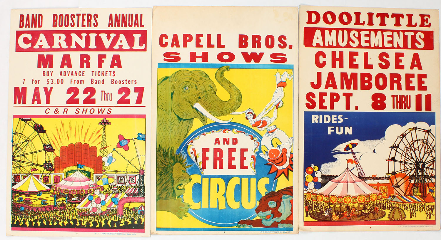 Lot of 3 cardboard posters for Amusement, Carnival or Circus, all made by Colorcraft Poster Co. Okla City OK, 14'' x 22''. Grade: Excellent - Value: 10 to 60