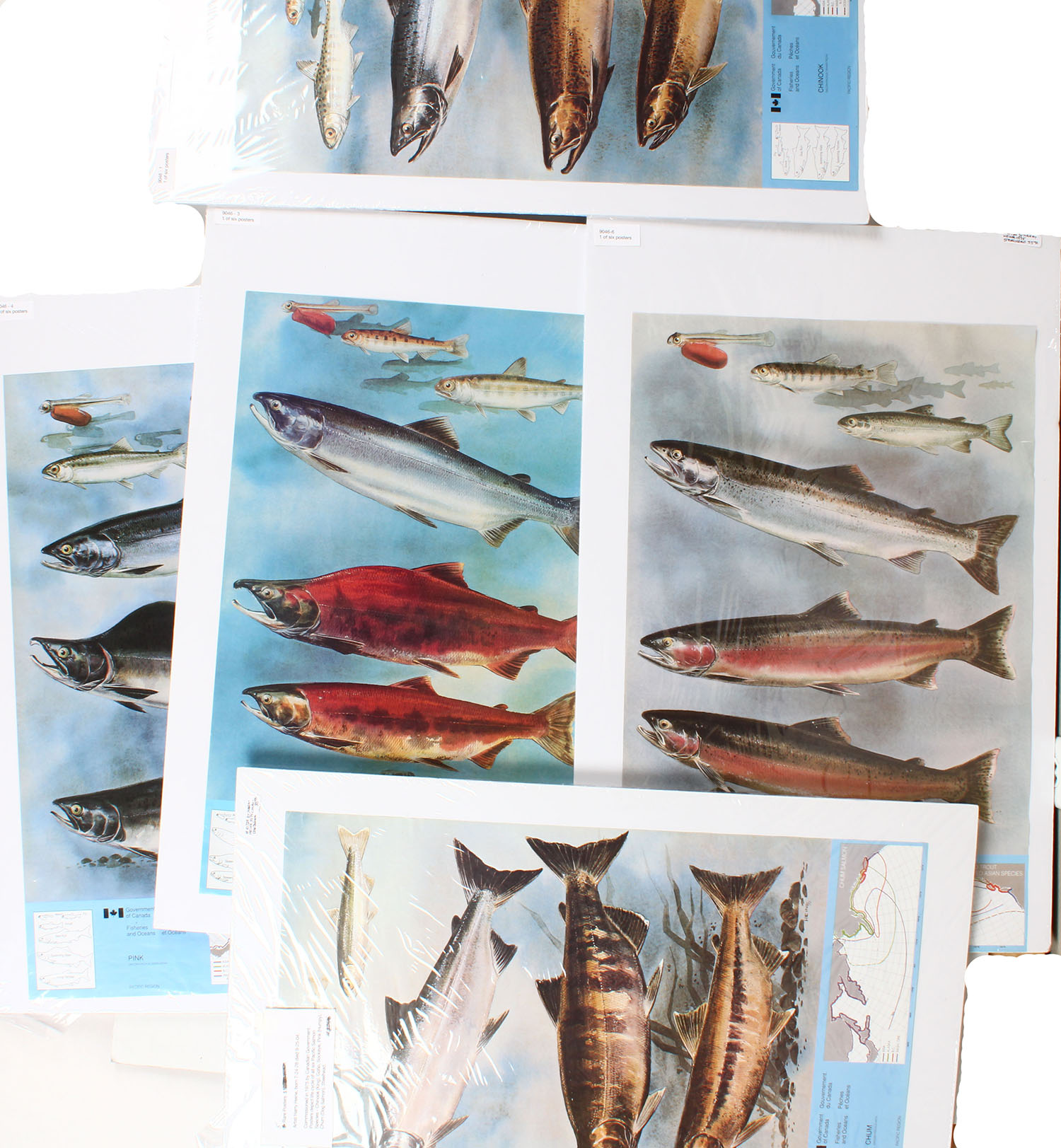Lot of 6 Posters by Canada Government, pictured are Steelhead, Sockeye, Pink, Chinook, Chum, 17'' x 26''. Grade: Excellent - Value: 10 to 50