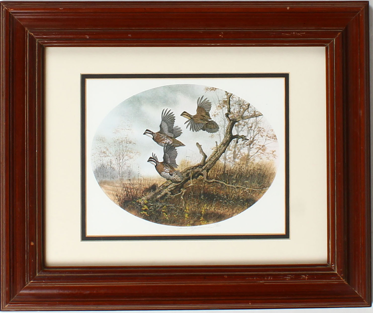 David Hagerbaumer print, full color fall image of quail in flight, 155/450, 9'' x 7'' image size, framed. Grade: MINT - Value: 50 to 200
